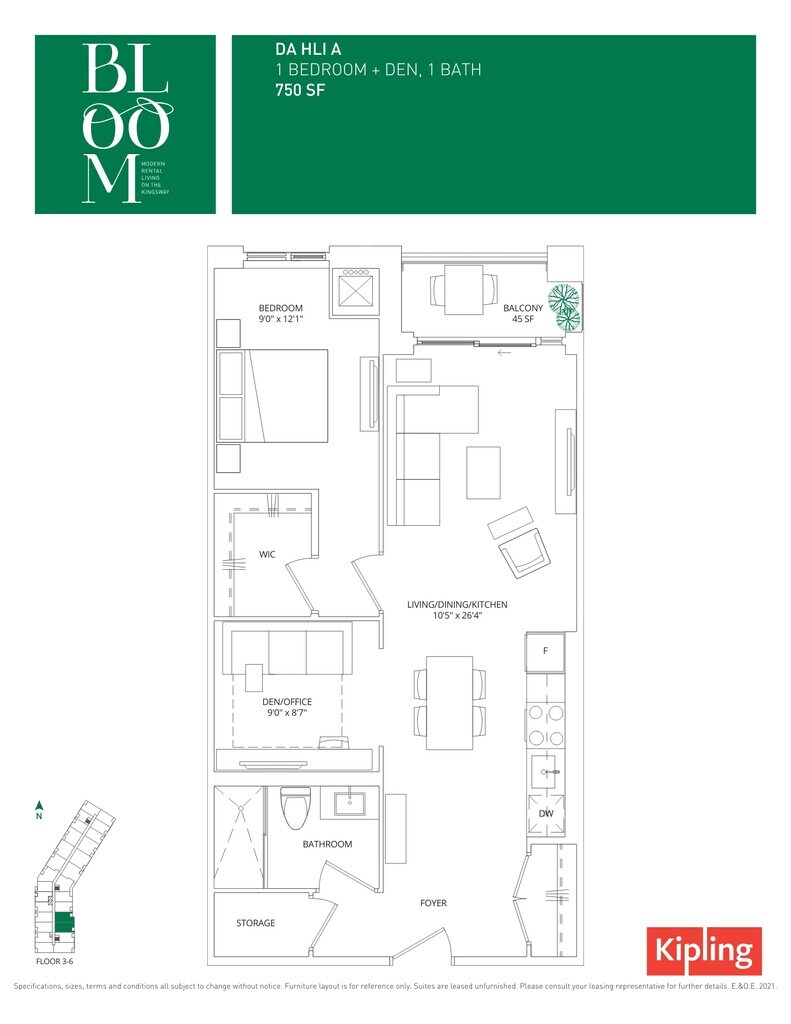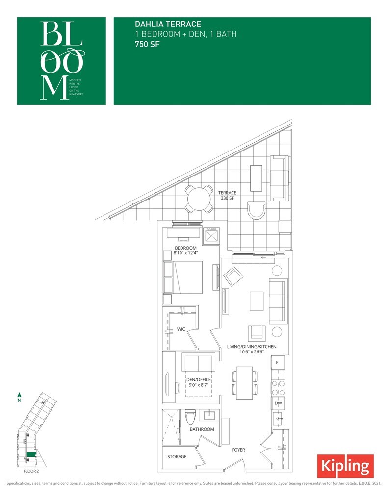 Unit: Azalea - Floorplan 10 Apartment Unit: DahliaApartment Model: One Plus Den$2,3831 Bedroom, 1 Bath, 750 sq ftAvailable Now![]()