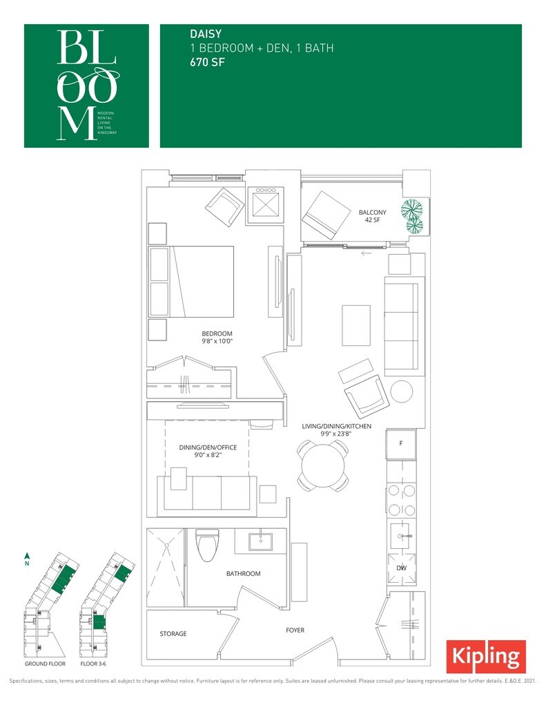 Unit: Dahlia - Floorplan 1 Apartment Unit: DaisyApartment Model: One Plus Den$2,2401 Bedroom, 1 Bath, 670 sq ftAvailable Now![]()