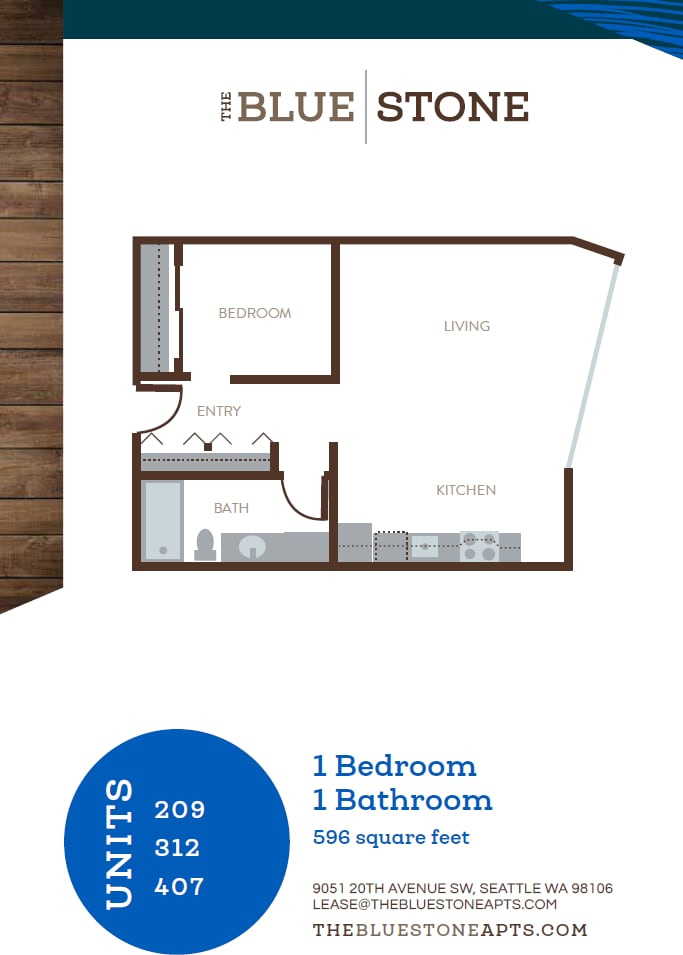 At Blue Stone, you will find a boutique complex with just 44 well designed and appointed one and two bedroom homes, as well as live work apartments. All of our apartments boast attention to detail and are filled with natural light. Each home has lovely hardwood plank look flooring, custom cabinets over quartz counter tops and sleek stainless steel appliances. All of the modern details you would hope for in your apartment home. Located in the heart of the vibrant Highland Park district, you will never be more than 20 minutes away from Downtown, just a five minute walk to the nearby Westwood Village Shopping Center, Roxhill Park and only a quick drive to Lincoln Park and Alki Beach. When not exploring your new neighborhood, come on up to the roof top deck where you will find picturesque views of West Seattle, and a BBQ perfect for entertaining friends and family. Call or text today to schedule a tour!