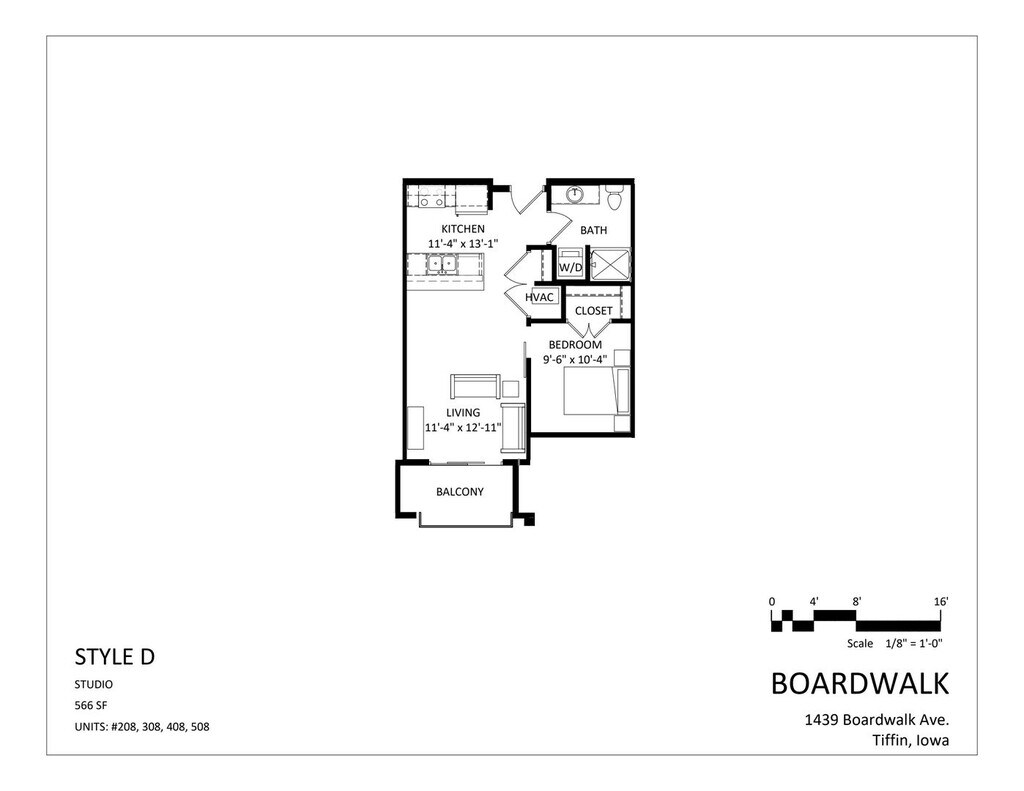Welcome to Boardwalk - Studio Style E, a newly constructed apartment located in the vibrant city of Tiffin, IA. This studio apartment, situated at the strategic intersection of I-380 & I-80 offering easy access to surrounding cities. The apartment has numerous luxurious features such as quartz countertops, stainless steel appliances, soft close cabinetry, and LVP flooring. It also features large windows in the open-concept bedroom allowing for the entire apartment to be filled with natural light. Enjoy the breakfast bar style kitchen island, perfect for casual dining or entertaining guests. The apartment is equipped with a mini-split air system to ensure your comfort throughout the year. Step outside to your private patio, a perfect spot for relaxation or outdoor dining. Experience the perfect blend of luxury and convenience at Boardwalk - Studio Style E.