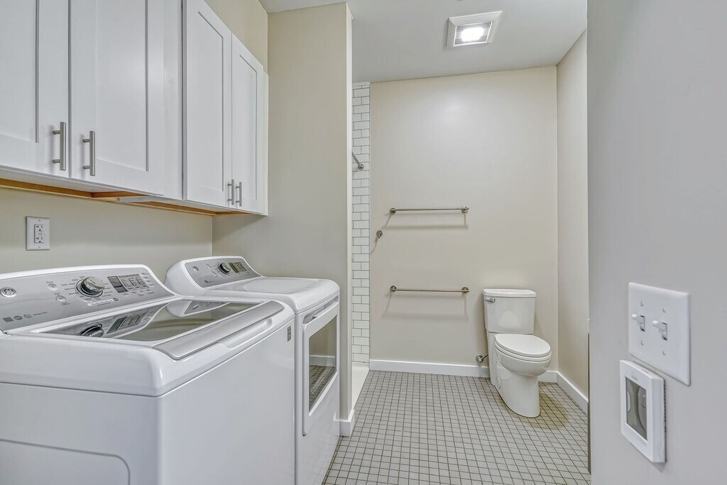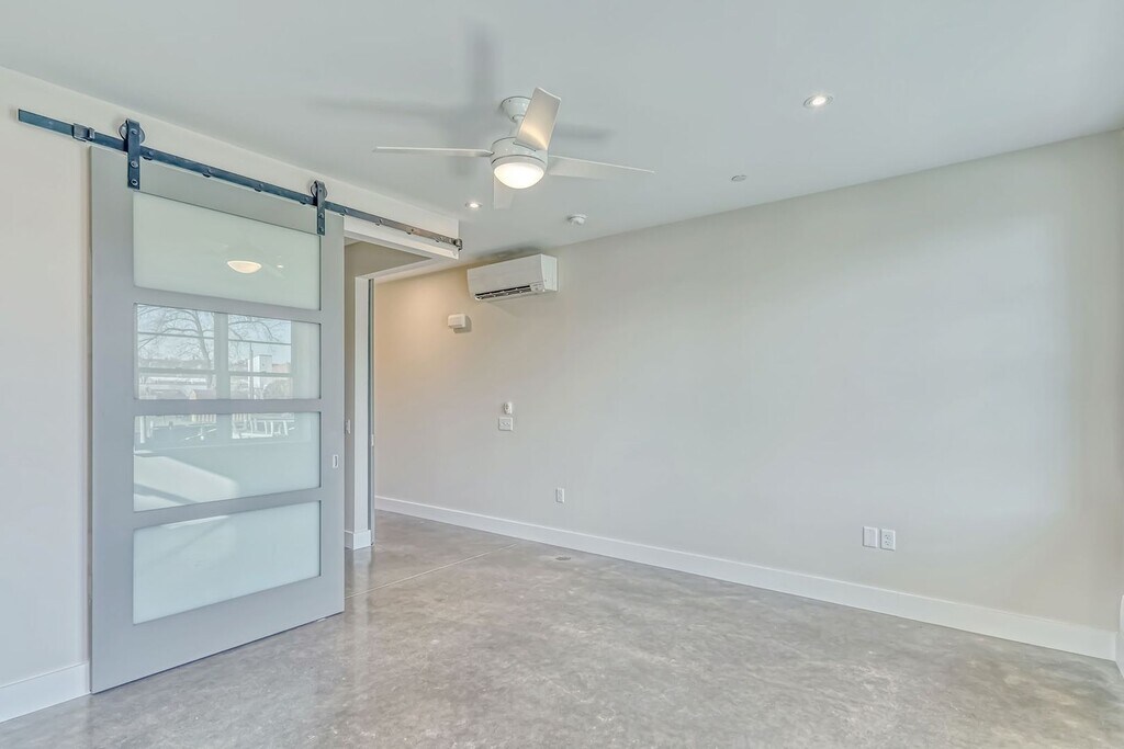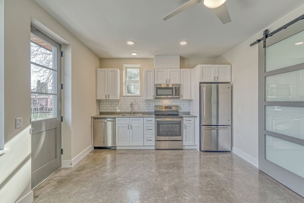The Laser is a first-floor open concept studio with polished concrete flooring. The bathroom offers radiant heat flooring, and a walk-in shower with subway tiles. The flex space features barn doors, a walk-in closet, and is perfect as a sleeping nook or office area. The living space features a full kitchen, dining and living room with access to exterior steps to the inlet.