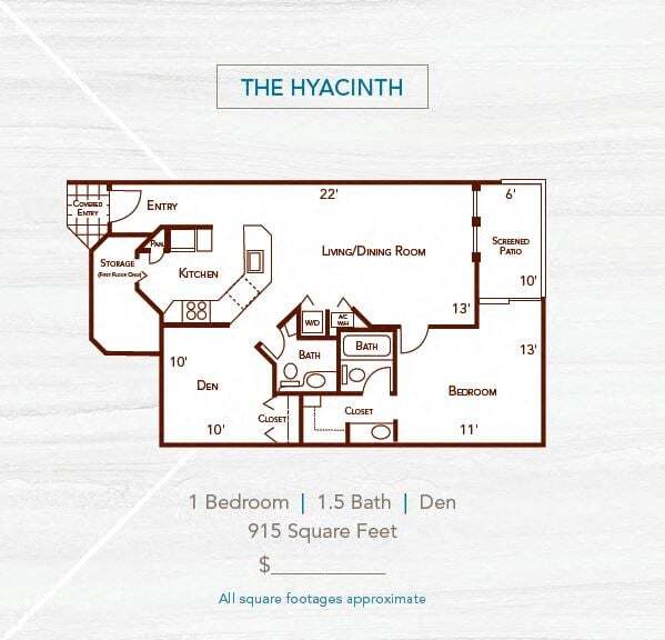 Availability Date Unit Sq Ft Call for Availability The Hyacinth 915 sq ft Model Amenities and Features