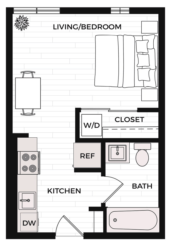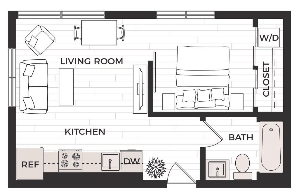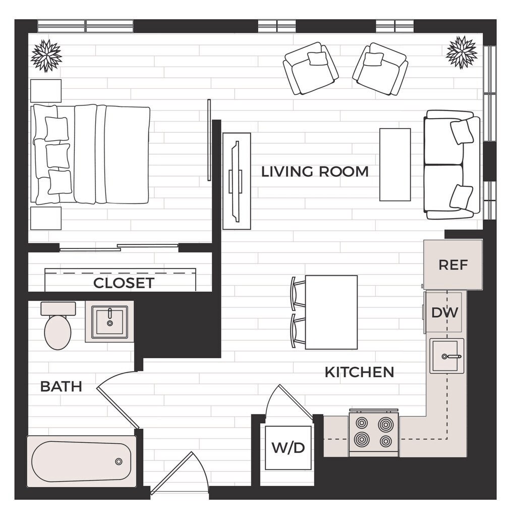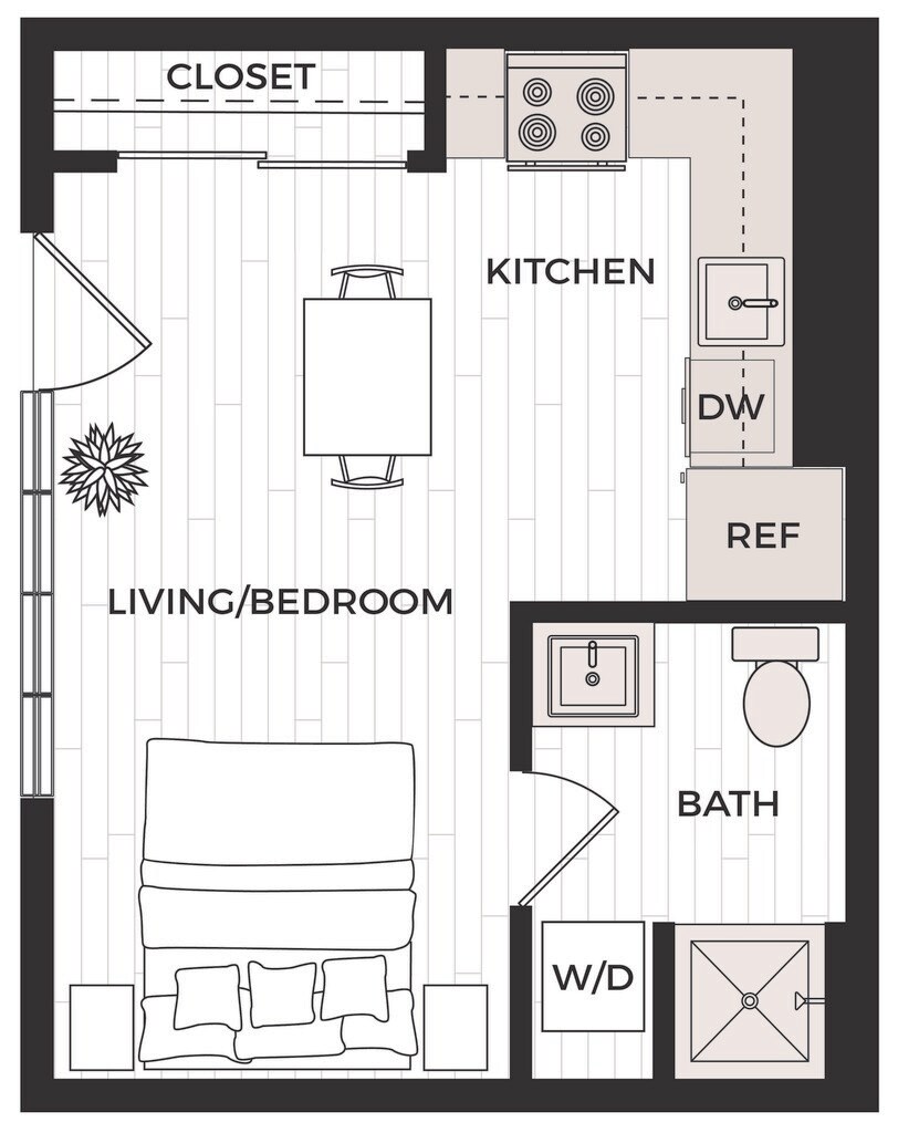 Studio B - Floorplan 1 Apartment Unit: 503Apartment Model: Studio B$1,199Studio, 1 Bath, 383 sq ftAvailable NowStudio A