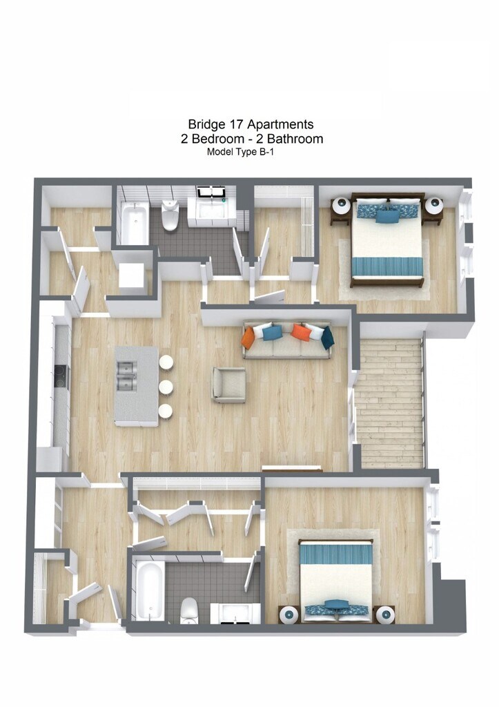 Bridge 17 Apartment Homes offers 1 to 2 Bedroom apartments starting from $1,500 and having 900–1,100 sq ft. Here is the current pricing and availability: