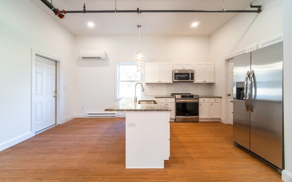 Unit 5 is an incredible example of exquisite open-style living with soaring ceilings and windows overlooking the kitchen and living areas. This former school building was fully gut-renovated to provide gorgeous details like wide-board flooring, high-end cabinetry, granite counters and a highly efficient HVAC system. Stainless steel kitchen appliances, primary bedroom with huge walk-in closet, his-and-hers bathroom sinks, washer/dryer, and much more!