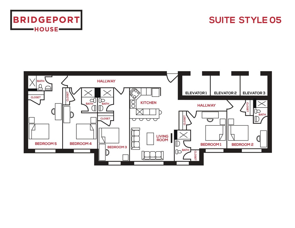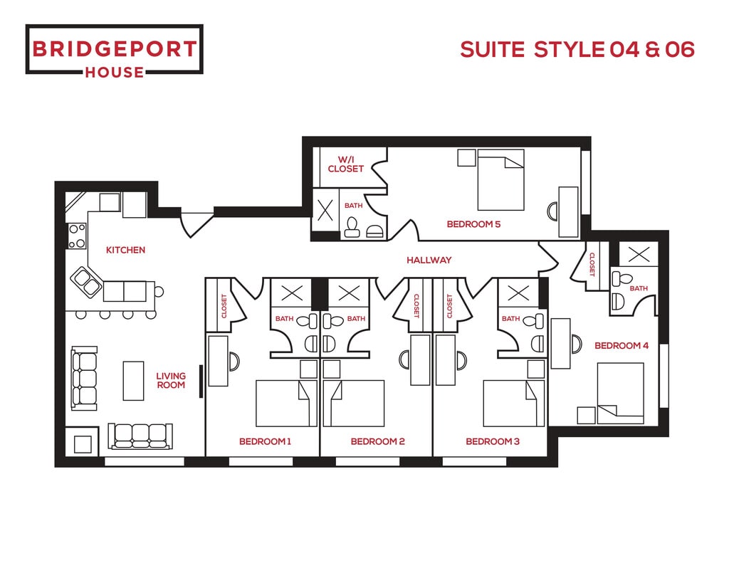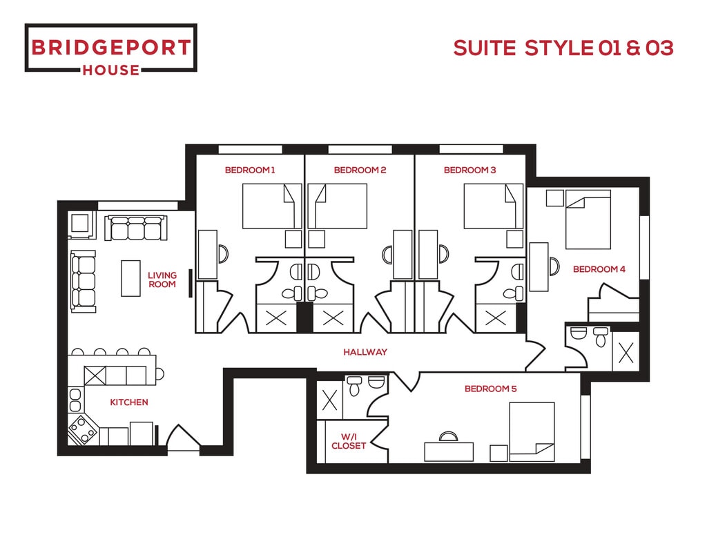 Bridgeport House offers 5 Bedroom apartments starting from $817 and having 1,003 sq ft. Here is the current pricing and availability: