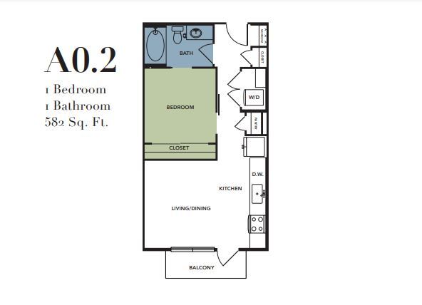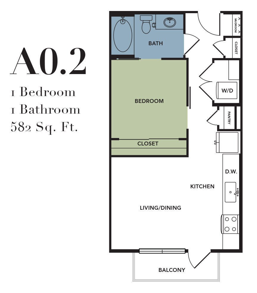 Apartment Model: A0.2From $1,044Studio, 1 Bath, 582 sq ftAvailable NowFloor plans are artist's rendering. All dimensions are approximate. Actual product and specifications may vary in dimension or detail. Not all features are available in every rental home. Prices and availability are subject to change. Base rent is based on monthly frequency. Additional fees may apply, such as but not limited to package delivery, trash, water, amenities, etc. Deposits vary. Please see a representative for details.