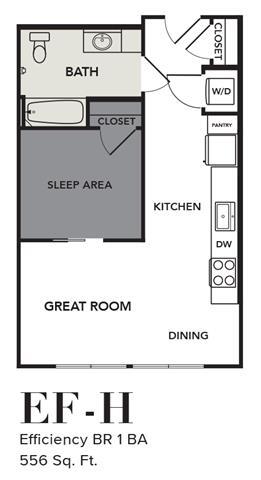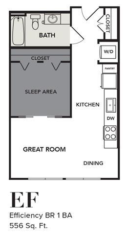 Apartment Model: EFFrom $1,197Studio, 1 Bath, 556 sq ftAvailable NowFloor plans are artist's rendering. All dimensions are approximate. Actual product and specifications may vary in dimension or detail. Not all features are available in every rental home. Prices and availability are subject to change. Base rent is based on monthly frequency. Additional fees may apply, such as but not limited to package delivery, trash, water, amenities, etc. Deposits vary. Please see a representative for details.