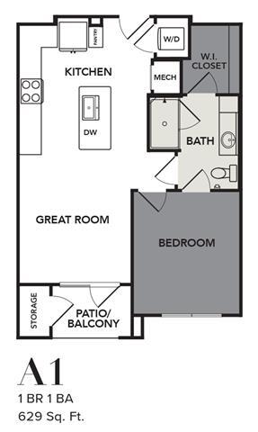 Apartment Model: A1From $1,2531 Bedroom, 1 Bath, 629 sq ftAvailable NowFloor plans are artist's rendering. All dimensions are approximate. Actual product and specifications may vary in dimension or detail. Not all features are available in every rental home. Prices and availability are subject to change. Base rent is based on monthly frequency. Additional fees may apply, such as but not limited to package delivery, trash, water, amenities, etc. Deposits vary. Please see a representative for details.