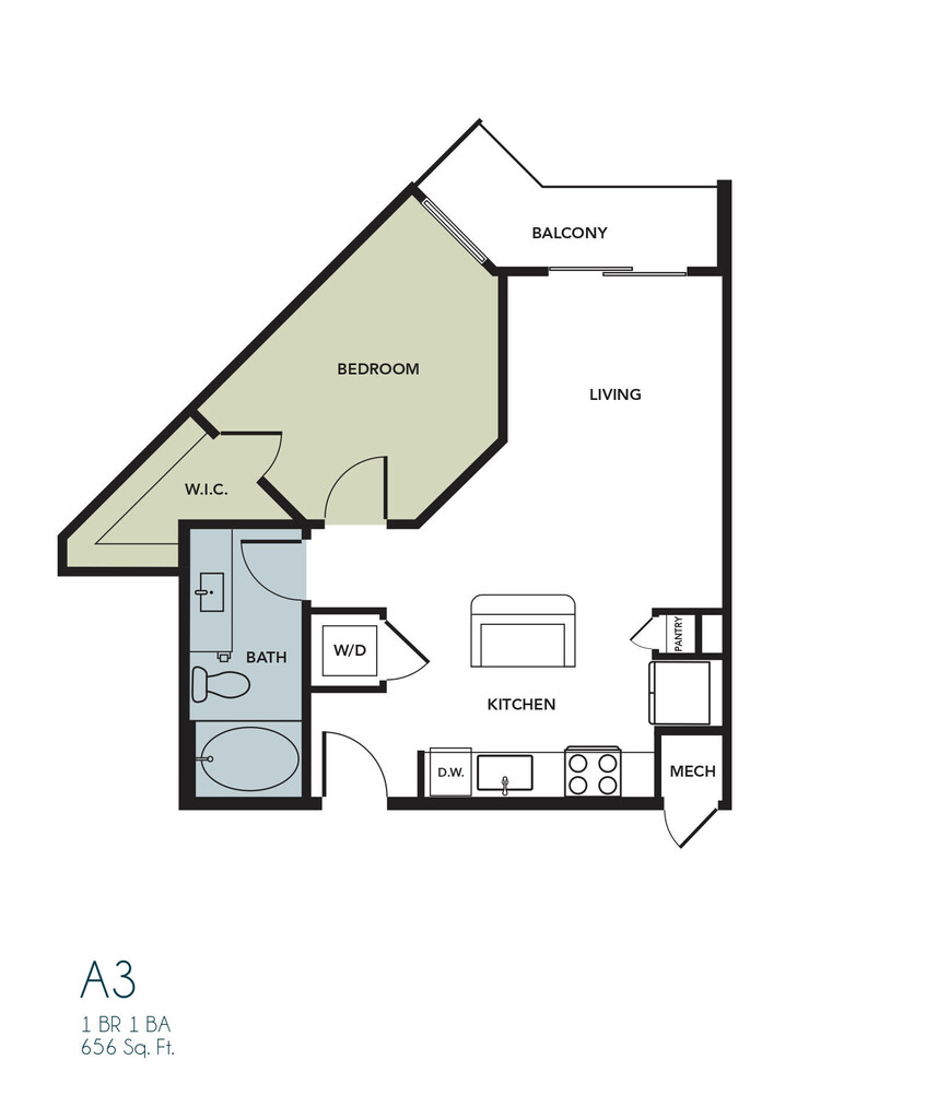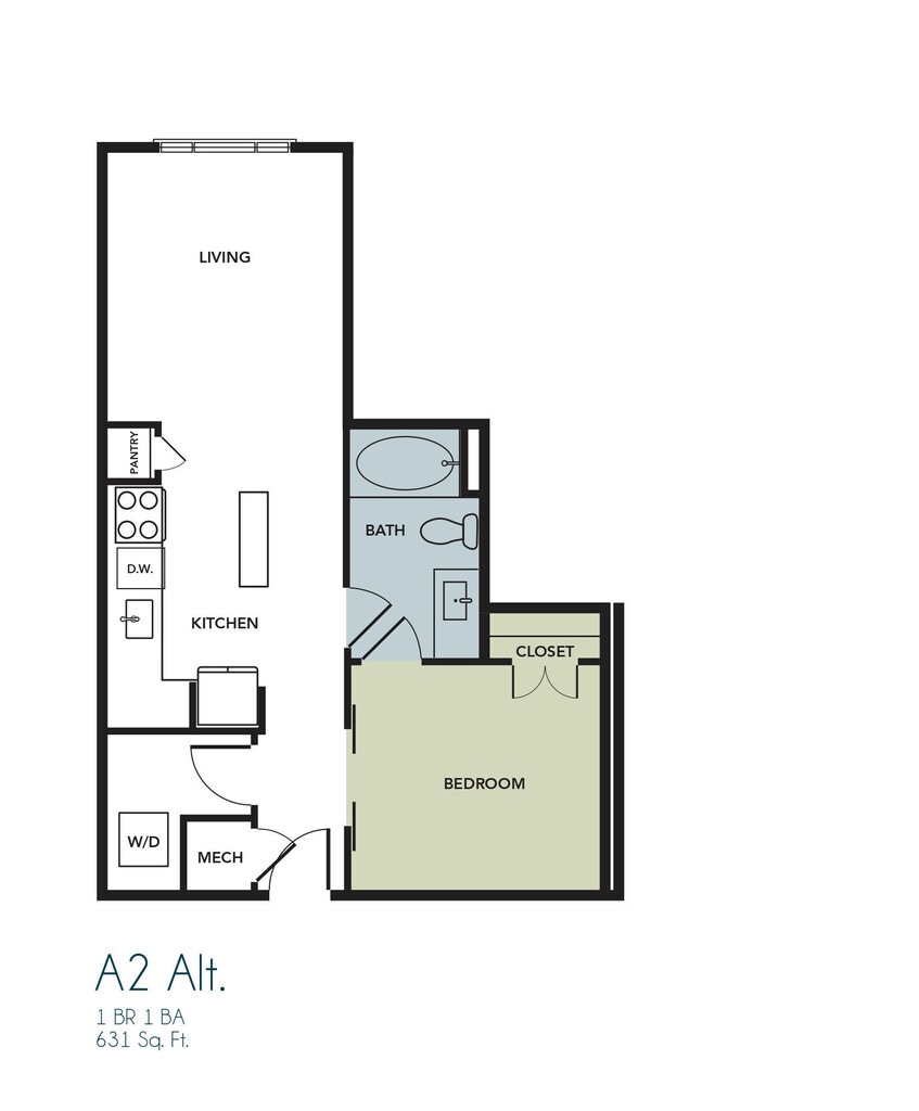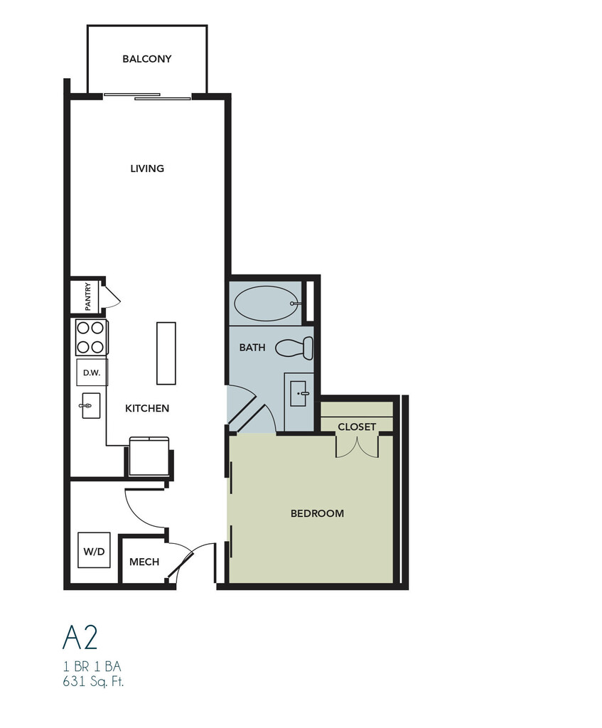 Apartment Model: A2From $1,1501 Bedroom, 1 Bath, 631 sq ftAvailable NowFloor plans are artist's rendering. All dimensions are approximate. Actual product and specifications may vary in dimension or detail. Not all features are available in every rental home. Prices and availability are subject to change. Base rent is based on monthly frequency. Additional fees may apply, such as but not limited to package delivery, trash, water, amenities, etc. Deposits vary. Please see a representative for details.
