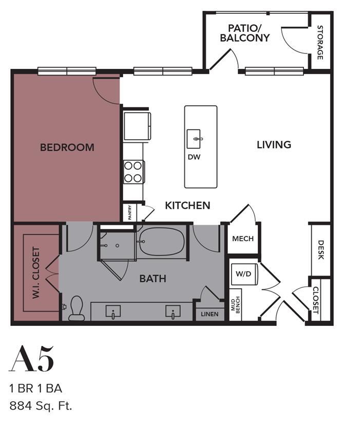 Apartment Model: A5From $1,7081 Bedroom, 1 Bath, 884 sq ftAvailable NowFloor plans are artist's rendering. All dimensions are approximate. Actual product and specifications may vary in dimension or detail. Not all features are available in every rental home. Prices and availability are subject to change. Base rent is based on monthly frequency. Additional fees may apply, such as but not limited to package delivery, trash, water, amenities, etc. Deposits vary. Please see a representative for details.