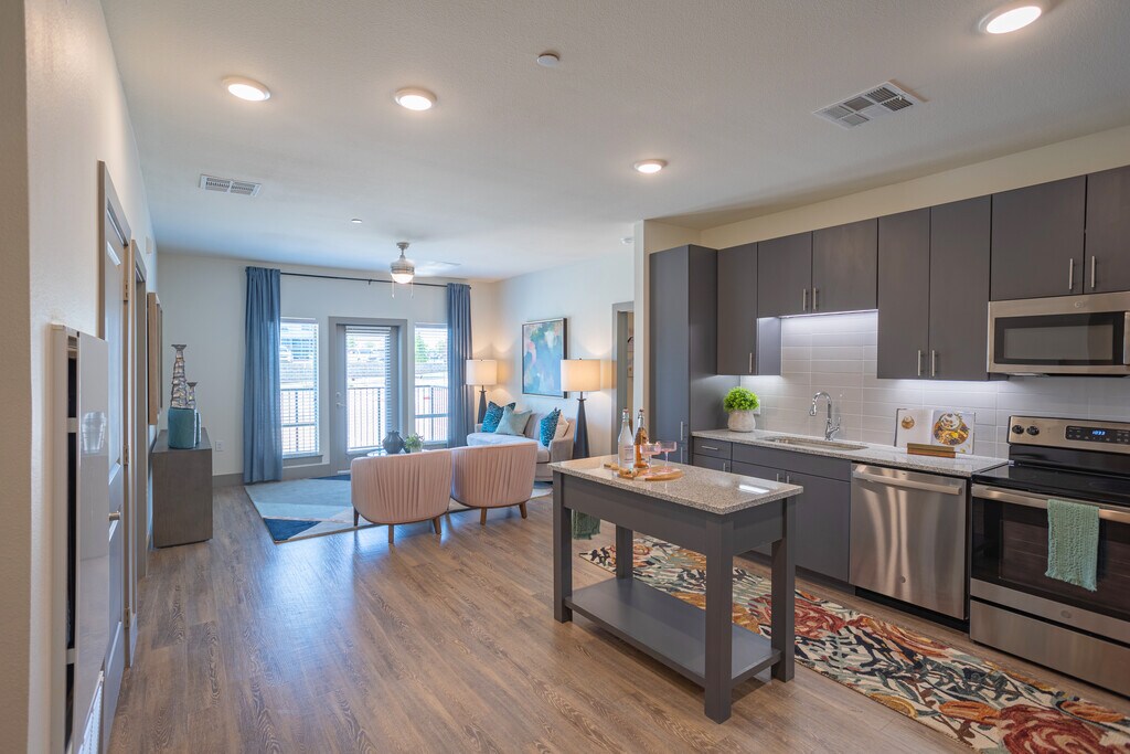 Experience the blend of city life with lakeside tranquility in our four-story, state-of-the-art residence. Every apartment is a masterpiece of modern living, featuring spacious walk-in closets, balconies, and elegant hardwood floors. The heart of your home — the kitchen — is equipped with granite countertops, a kitchen island, stainless steel appliances, and hardwood cabinets, making it the epitome of contemporary style.