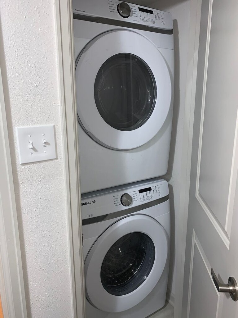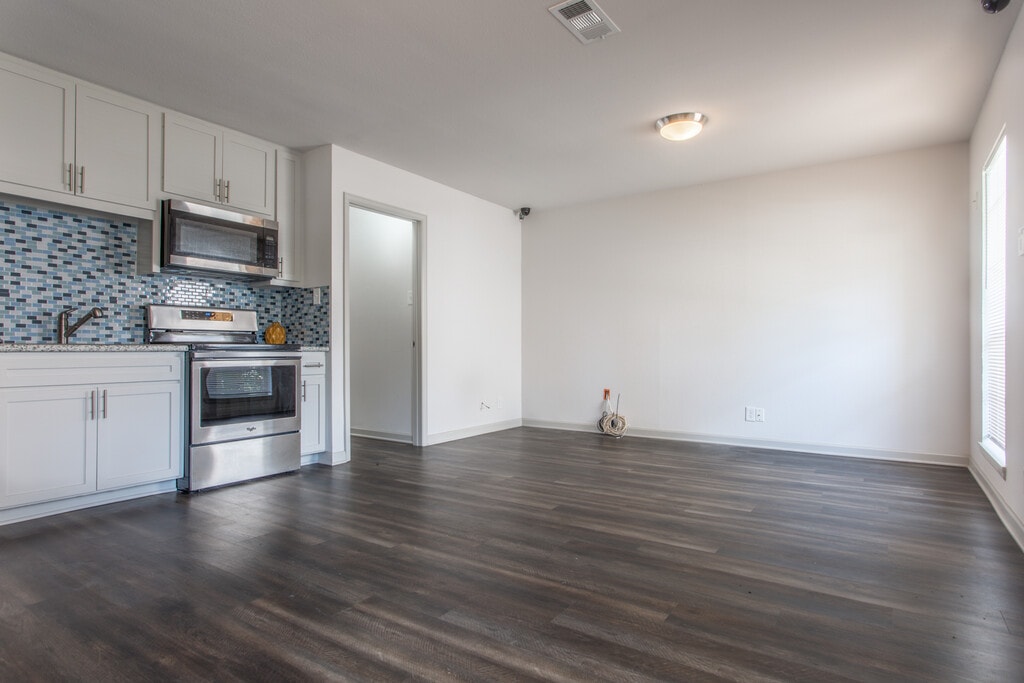 Open Concept kitchen and living room with colorful backsplash designer finished kitchen , stainless steel appliances, granite counter tops in the kitchen and bathroom, hardwood floors, extra large walk in closet, full sized front loading washer & dryer ($65) and sliding glass door that opens up to large private patio with high fence.