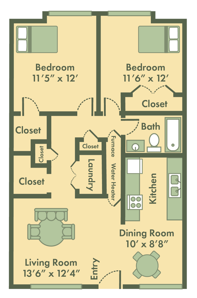 2 Beds, 1 Bath, 1050 sq ftAvailable NowLargest 2 BedroomThis is the largest 2 Bedroom at this PropertyModel Gallery