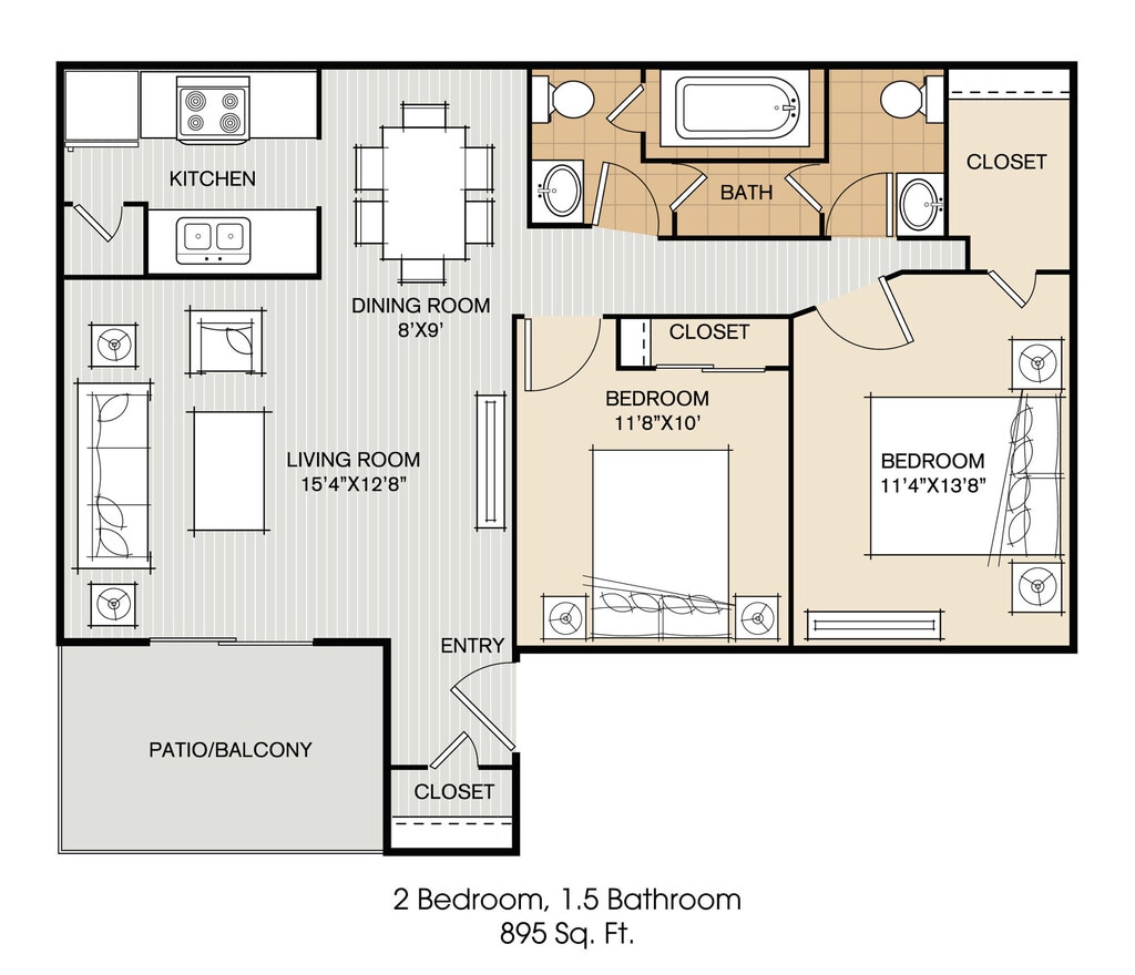 2 Beds, 1.5 Baths, 895 sq ftModel Gallery
