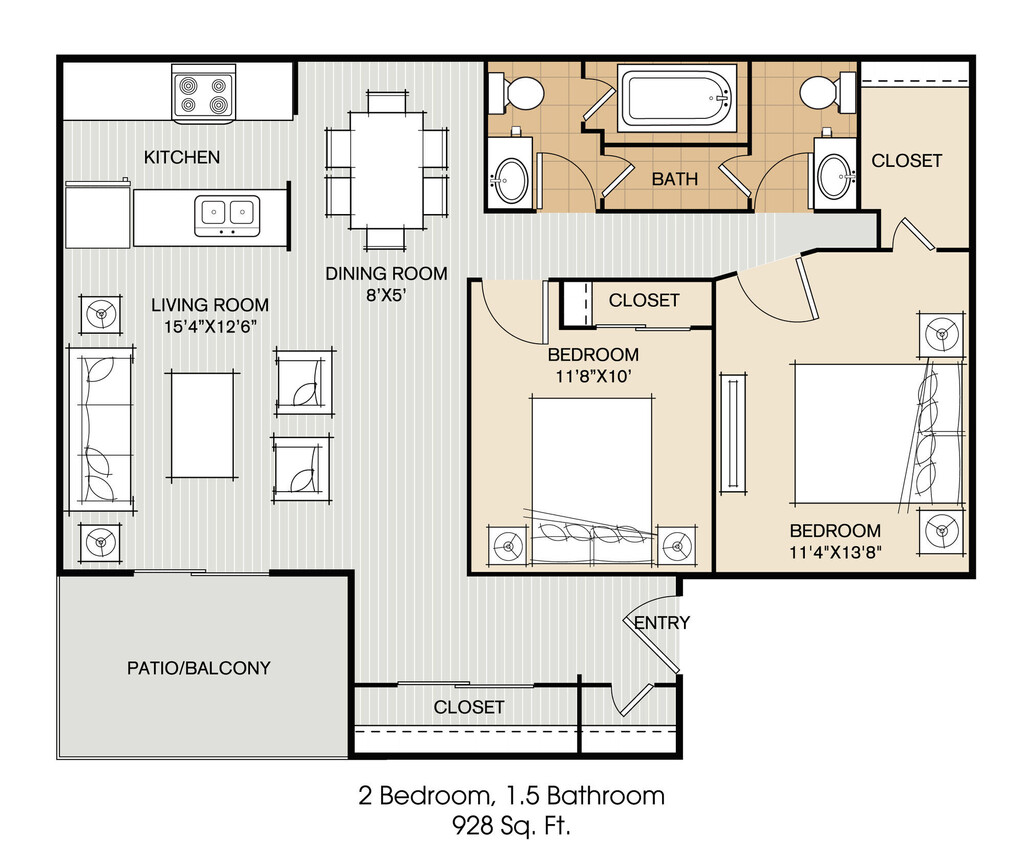 2 Beds, 1.5 Baths, 928 sq ftModel Gallery