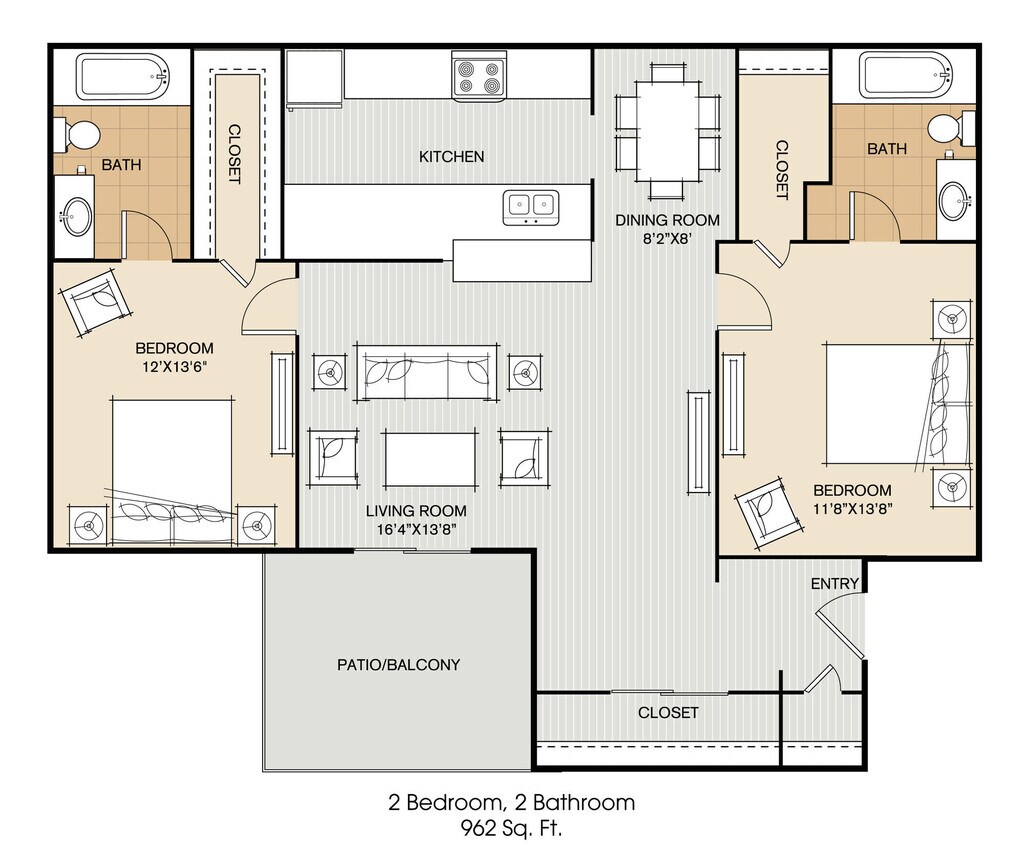 2 Beds, 2 Baths, 962 sq ftLargest 2 BedroomThis is the largest 2 Bedroom at this PropertyModel Gallery
