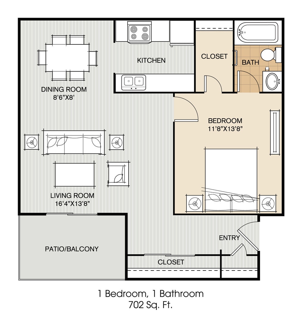1 Bed, 1 Bath, 702 sq ftAvailable NowModel Gallery