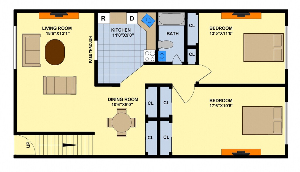 Two Bedroom (Upstairs) - Floorplan 7 Apartment Unit: 10BApartment Model: Two Bedroom (Upstairs)$2,6652 Bedroom, 1 Bath, 870 sq ftAvailable Now