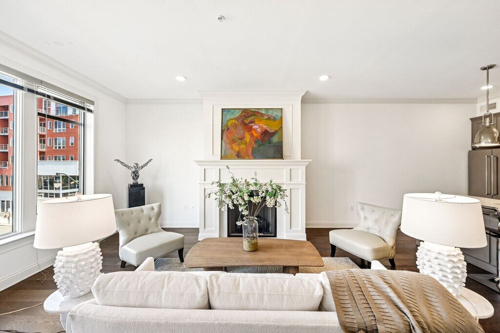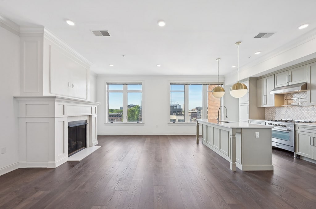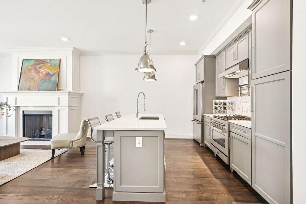 Welcome to The Brunner - Residence 403. This 1 bedroom, 1.5 bathroom features a custom built-in fireplace, large windows, and high ceilings. The gourmet kitchen includes a 36 inch gas range, quartz countertops, custom cabinetry, and ample counter tops. The bedroom has a large walk-in closet with custom built-in shelves. The bathroom comes complete with backlit mirrors, tiled showers, and quartz countertop. A full-size in-unit washer/ dryer and attached garage available for residents convenience.