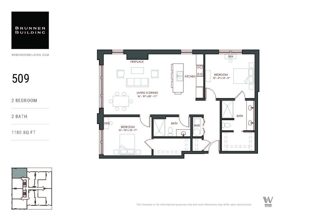 Brunner Building offers 1 to 2 Bedroom apartments starting from $1,895 and having 876–1,324 sq ft. Here is the current pricing and availability: