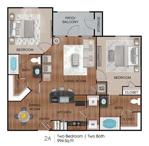 2A - Floorplan 1 Apartment Unit: 440Apartment Model: 2A2 Bedroom, 2 Bath, 994 sq ftAvailable NowApartment Unit: 306Apartment Model: 2A2 Bedroom, 2 Bath, 994 sq ftAvailable NowApartment Unit: 140Apartment Model: 2A2 Bedroom, 2 Bath, 994 sq ftAvailable NowFloorplan 2C
