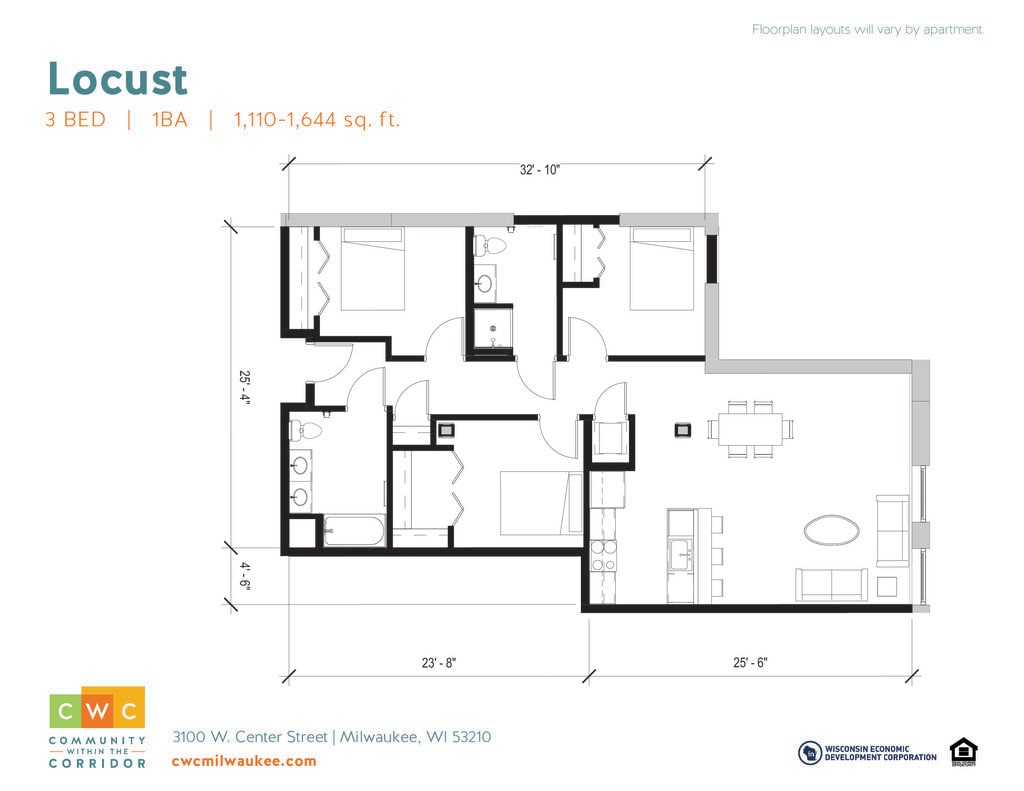 Apartment Model: LocustCall For Rates3 Bedroom, 2 Bath, 1215 sq ftUnavailableLocust - Floorplan 1 4 Bedrooms