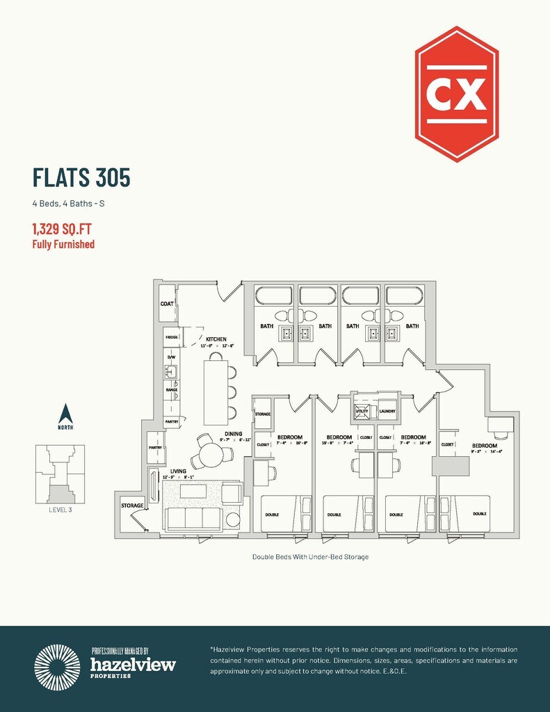 CX offers 2 to 4 Bedroom apartments starting from $985 and having 332–1,311 sq ft. Here is the current pricing and availability: