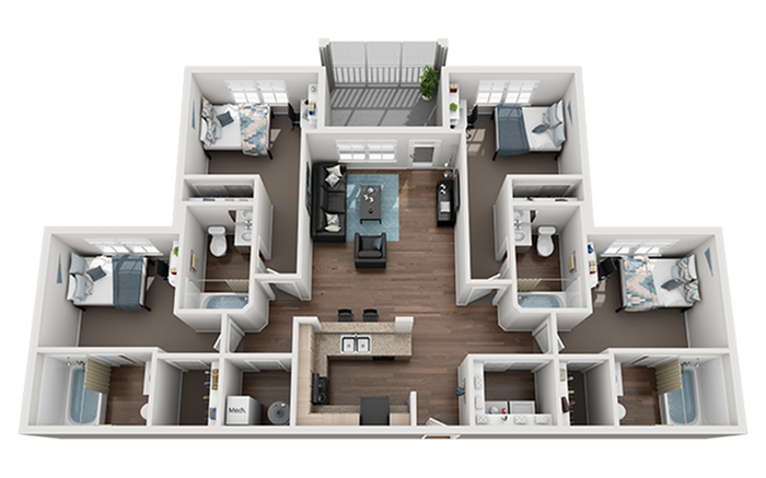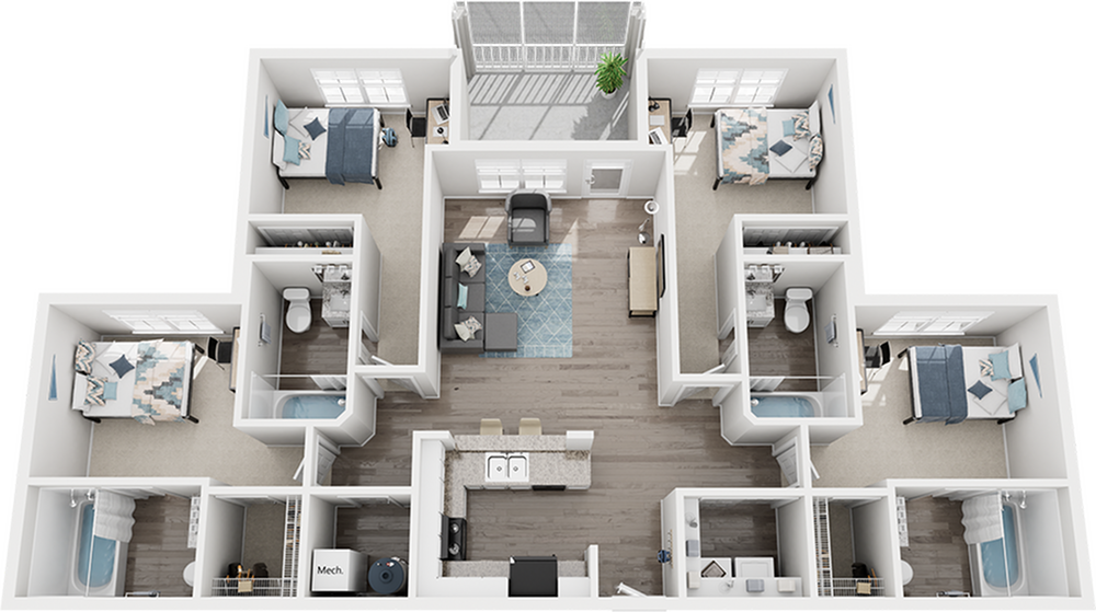 Welcome to Cabana Beach San Marcos, your destination for premium off-campus apartments near Texas State University. We offer open concept studio, 2, 3 and 4 bedroom apartments, all with private bedrooms and private bathrooms. Each fully furnished apartment includes a newly upgraded full kitchen with granite countertops and energy efficient appliances, an upgraded living room with a new modern furniture package and 55" TV, washer and dryer, and high speed internet access, and a private screened-in patio. We also offer upgraded features such as walk-in closets, pool views, and reserved covered parking. Cabana Beach San Marcos is the 1st stop on the TXST Bobcat Shuttle route, making your commute to class a breeze. We're located less than 10 minutes from the San Marcos Outlet Mall, a 3 minute walk to Central Texas Medical Center, and just minutes from many local restaurants and other shopping destinations. When you're not in class or exploring the surrounding San Marcos area, you'll love enjoying our community amenities such as our recently renovated fitness center, resort-style swimming pool, outdoor grilling stations, full size basketball court, dog park and more!