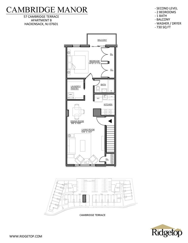 Cambridge Manor offers beautiful and spacious one and two-bedroom garden apartments located within walking distance of Hackensack University Medical Center. Our updated apartments offer the convenience of an in-unit washer and dryer, open-concept floor plans as well as beautiful and durable Silestone countertops. Cambridge Manor residents can also obtain garage parking, private parking spaces and on-site storage units. New Jersey Transit bus stops are located just one block away on Summit Avenue offering service with final destination of the Port Authority Bus Terminal in Midtown Manhattan. Cambridge Manor is centrally located with easy access to all Hackensack has to offer. Cats and small dogs are permitted at this Ridgetop Corporation property.