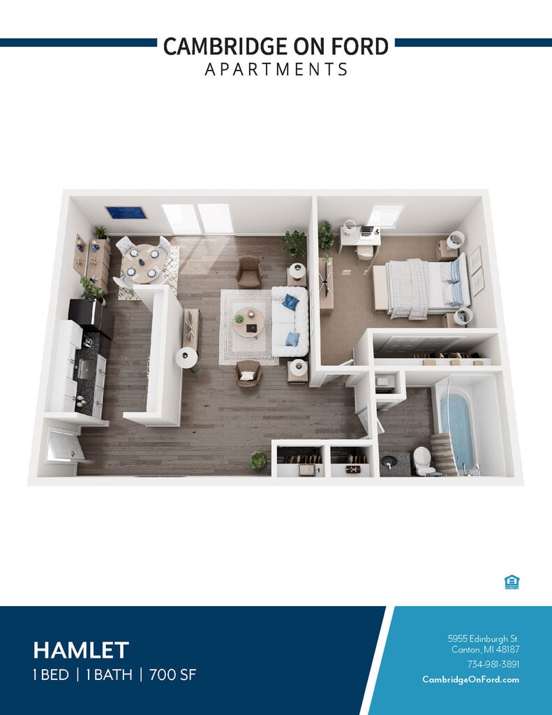 Cambridge on Ford offers 1 to 2 Bedroom apartments starting from $1,015 and having 700–900 sq ft. Here is the current pricing and availability: