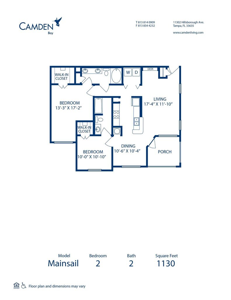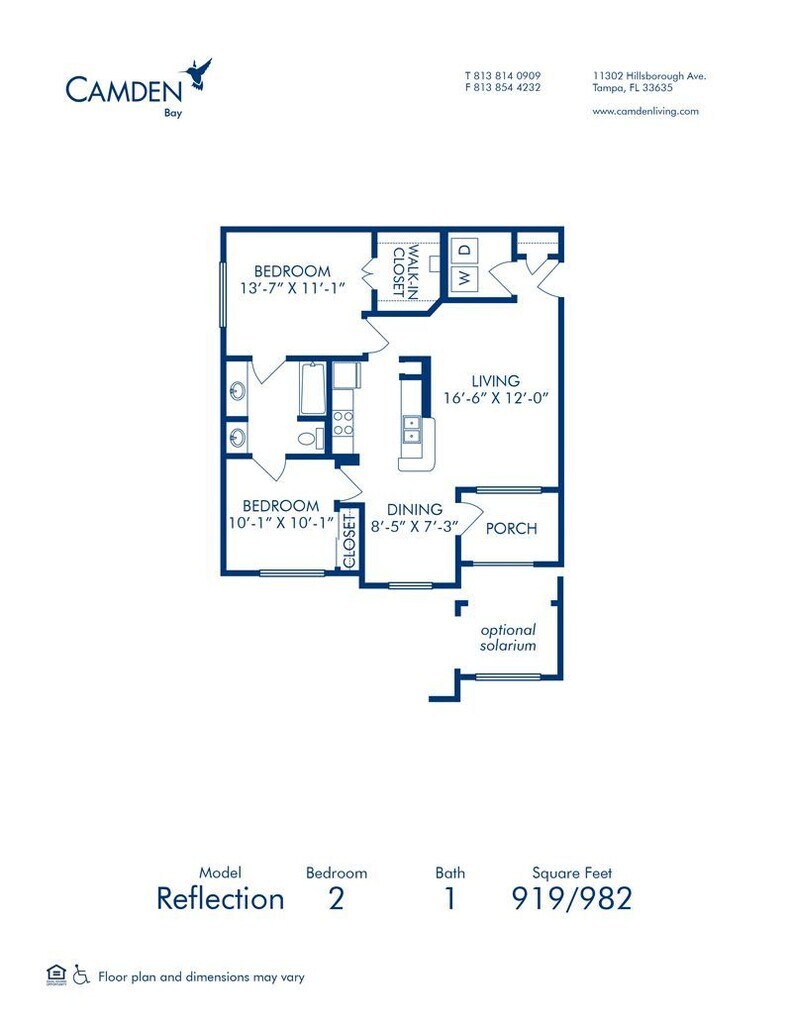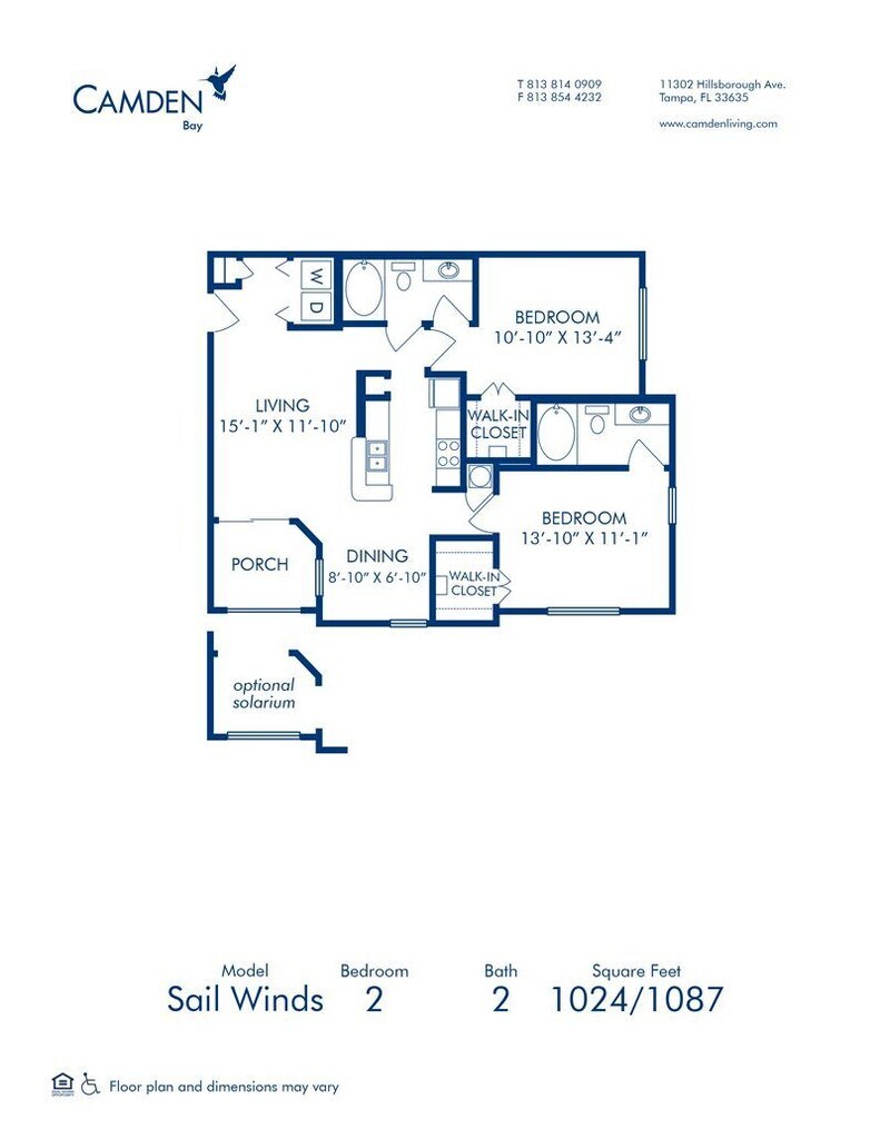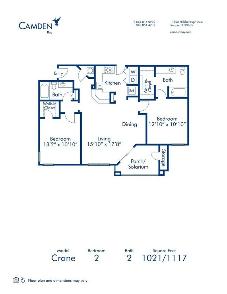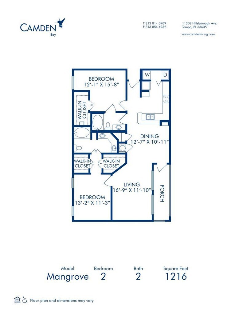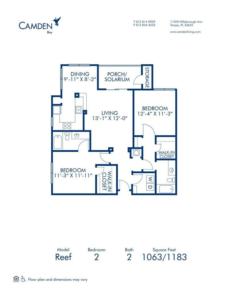 Surrounded by a 1,000-acre nature preserve, Camden Bay's 1, 2 and 3 bedroom floor plans have screened patios, bay views from select apartment homes, and private boat ramps with direct channel access to Tampa Bay. Enjoy luxurious modern features, which include white shaker cabinets with brushed nickel hardware, gray quartz countertops, stainless steel appliances, and a digital thermostat! A full-size washer and dryer, spacious walk-in closets, double vanity sinks, 9-foot ceilings, and wood-inspired flooring or carpet are just a few features that could be part of your new apartment home. We're ideally situated in Tampa Bay, bordering Hillsborough and Pinellas Counties, and minutes from Tampa International Airport, area beaches and downtown. Get in a great workout in the 24-hour fitness center and yoga studio. The community workspace includes a cloud-based printer and a large conference table that is an excellent option for anyone who works from home or needs flex space. Show off your pitmaster skills at the outdoor grill and enjoy the fruits of your labor at the poolside pavilion with your friends and family. Our non-smoking amenities help support your lifestyle and fitness goals, including our kayak and canoe racks with easy access to Tampa Bay, lighted tennis courts, two community pools, a playground, private garages, and storage, or give your car special attention at our Car Care Center. Camden Bay will be your pup's choice, too, because of the dog walk areas, dog park, dog agility course, and dog wash station. Camden residents can take advantage of an exclusive discount with CORT to rent furniture and accessories for your apartment home. We offer live video, self-guided, and team member tour options. We partner with Vero, a third-party screening company, to verify the identity and income of all applicants. Pricing and availability are subject to change until a quote is saved. Call or visit to save a quote.
