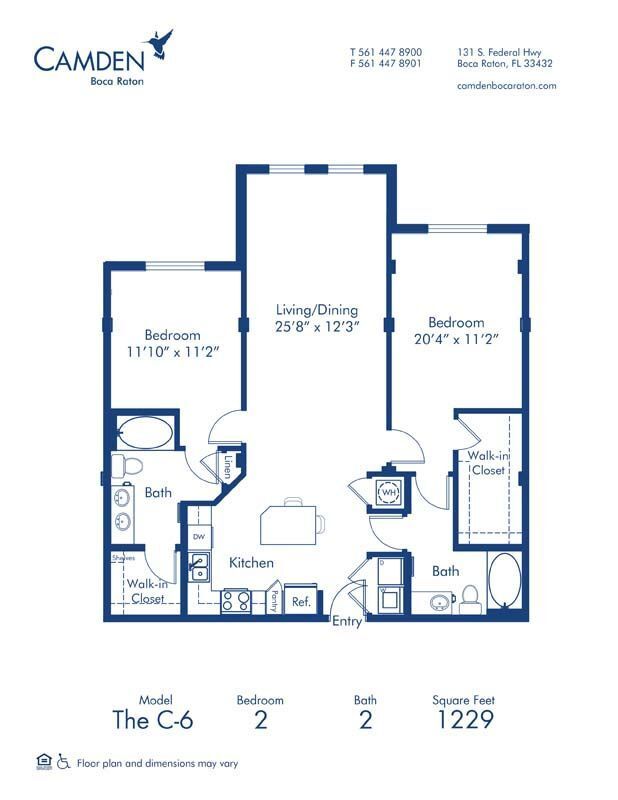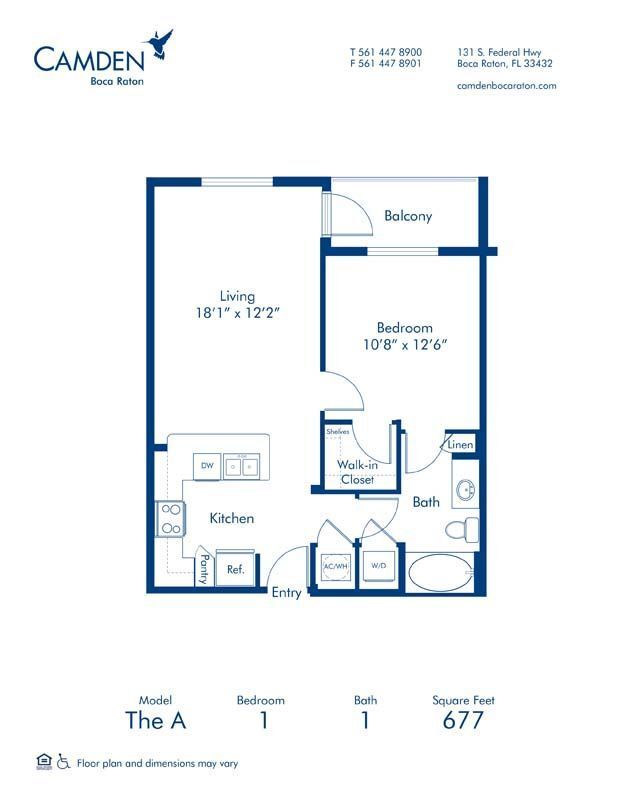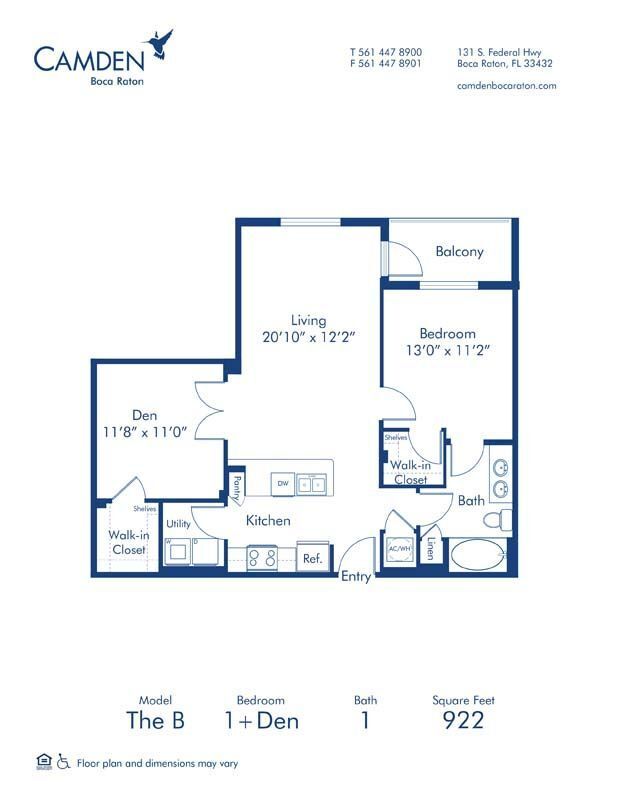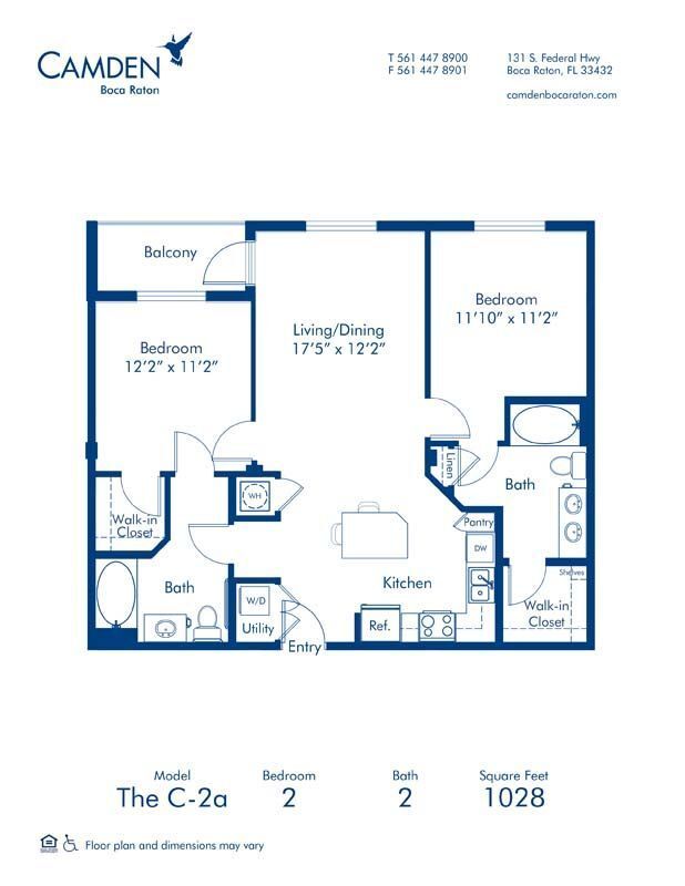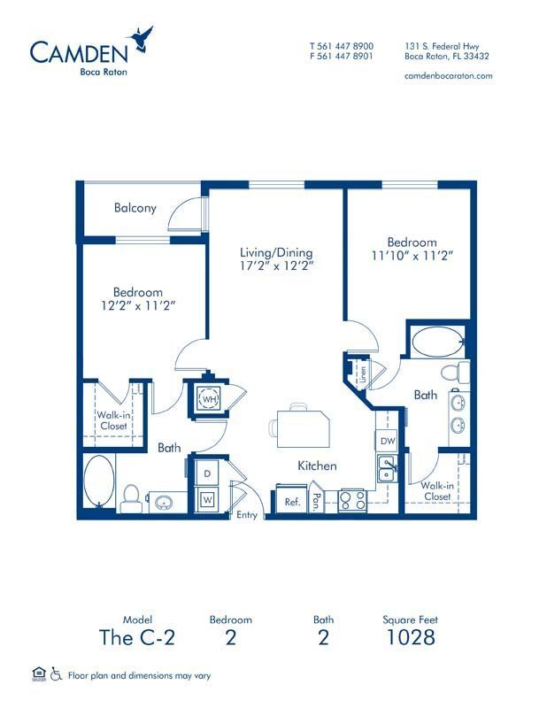 Camden Boca Raton Apartments, a unique, urban apartment community in Downtown Boca Raton, offers 1 and 2 bedroom apartments for you to choose from. Sip your morning coffee on our private balconies and enjoy the buzz of downtown Boca Raton before you start your day. Then it will be time for your inner chef to make an appearance. Create a gourmet meal in your modern kitchen with espresso cabinetry, stainless steel appliances including a microwave, brushed nickel hardware, and quartz countertops with a beautiful subway tile backsplash and USB outlets to charge your devices. It is any chef’s dream! Organize your shoes or handbags in the built-in shelving in your walk-in closet and enjoy other features such as wood-inspired flooring and an included washer and dryer. The B and The B-1 floor plan features a den, a fabulous option to create your very own dedicated home office space. Live in luxury, relax and unwind at any of our non-smoking amenities. Catch some rays at our private heated swimming pool or relax in the shade under the sunbeds. Our sixth-floor sky terrace is the perfect place to curl up with a good book and enjoy the breeze, socialize with neighbors, or enjoy the South Florida sun. If you have an electric car, we also have electric car charging stations available Ready to make it yours? We offer live video, self-guided, and team member tour options. Please call 24 x 7 to schedule. Apply online anytime and have peace of mind with Camden’s 30-Day Satisfaction Guarantee. Come home to Camden Boca Raton where we deliver lifestyle options that are #SoBoca. Schedule an appointment and see for yourself. Bonus! No deposit is required with approved credit! Some restrictions may apply. We partner with Vero, a third-party screening company, to verify the identity and income of all applicants. Pricing and availability are subject to change until a quote is saved. Call or visit to save a quote.