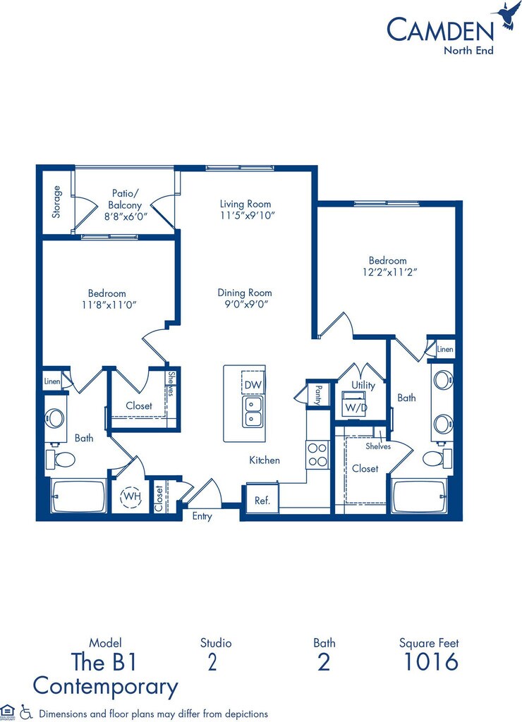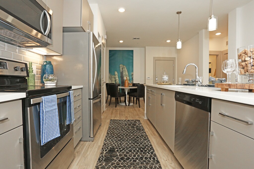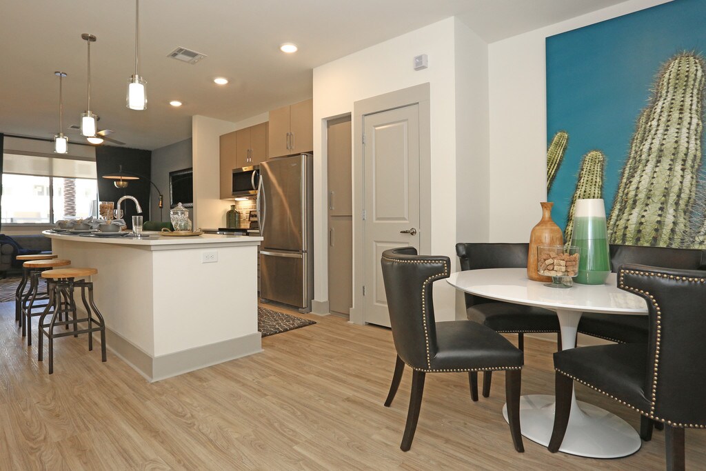 Camden North End offers a variety of open-concept studio, one, two- and three-bedroom luxury apartments and townhomes in Phoenix. Choose between two interior finish styles: Desert Modern or Contemporary. Desert Modern boasts gray bottom cabinetry with white upper cabinetry, white subway tile backsplash, and white quartz countertops, while Contemporary features gray cabinetry and white quartz countertops with gray subway tile backsplash. The A5, B3, and B5 floor plans feature a flexible dining area, perfect for working from home. All homes feature chef-inspired kitchens, quartz countertops, stainless steel appliances including glass stove cooktops, full-size washers and dryers, ceiling fans in living areas or bedrooms, walk-in closets, USB outlets, and more! Enjoy the lifestyle you deserve with 24-hour access to two fitness centers complete with strength training machines and yoga and spin studios with virtual training technology. Two pool and spa areas are complete with cabanas and lounges, and gaming is always an option with billiards and foosball tables. The community is non-smoking and pet-friendly with a pet wash area and two enclosed dog parks. We also have EV charging stations available! Just west of North Scottsdale, Camden North End is within walking distance of restaurants, shopping and Scottsdale 101 Shopping Center – all minutes from the 101 FWY. As an Airbnb-friendly community, residents can host their apartment home on Airbnb part-time, up to 90 days per year. (Hosting is subject to local laws and regulations.) Camden residents can take advantage of an exclusive discount with CORT to rent furniture and accessories for your apartment home. Pricing and availability are subject to change until a quote is saved. Call or visit to save a quote.