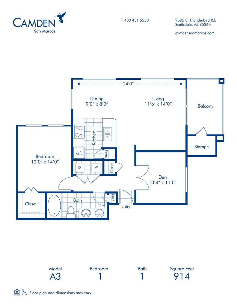 Apartment Model: A3 Den2 Bedroom, 1 Bath, 914 sq ftUnavailableA3 Den - Floorplan 1 Floorplan B1
