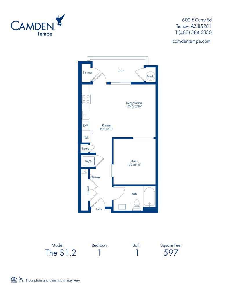 Apartment Model: S1.2Studio, 1 Bath, 597 sq ftUnavailableS1.2 - Floorplan 1 1 Bedroom