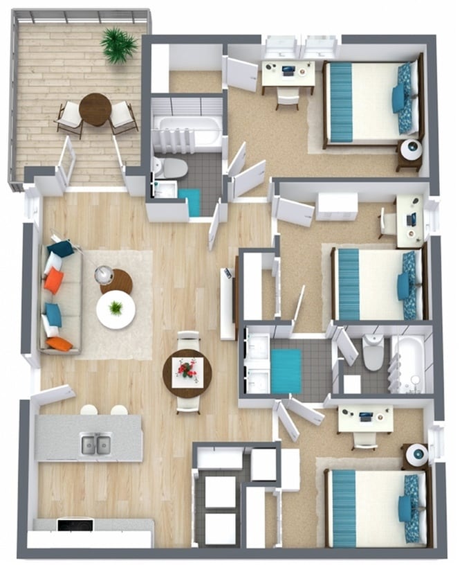 Apartment Model: Designer Style 3 Bed X 2 Bath - PatioFrom $6193 Bedroom, 2 Bath, 1040 sq ftAvailable Now![]()