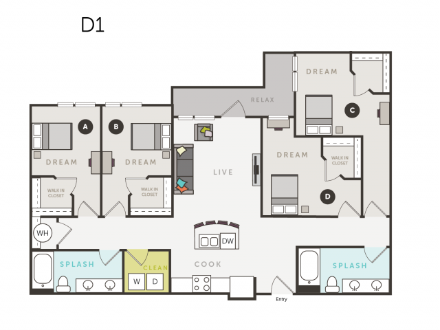 Apartment Model: D24 Bedroom, 4 Bath, 1427 sq ftAvailable NowD2 - Floorplan 1 Apartment Unit: Private BedroomApartment Model: D24 Bedroom, 4 Bath, 1427 sq ftAvailable NowApartment Unit: Private BedroomApartment Model: D24 Bedroom, 4 Bath, 1427 sq ftAvailable Now