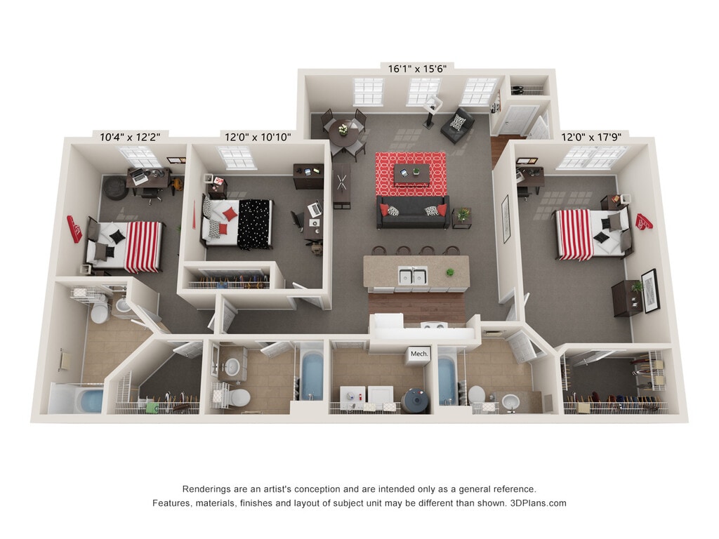 Apartment Model: Three Bedroom Mix$6253 Bedroom, 3 Bath, 1403 sq ftAvailable NowFloorplansPhotos![]()