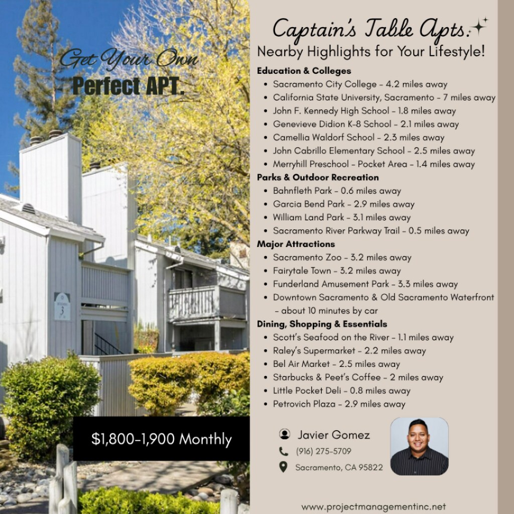 Captains Table Apartments - NEW is located in the Little Pocket Neighborhood and 95822 Zip code of Sacramento, CA. This community is professionally managed by Project Management, Inc.