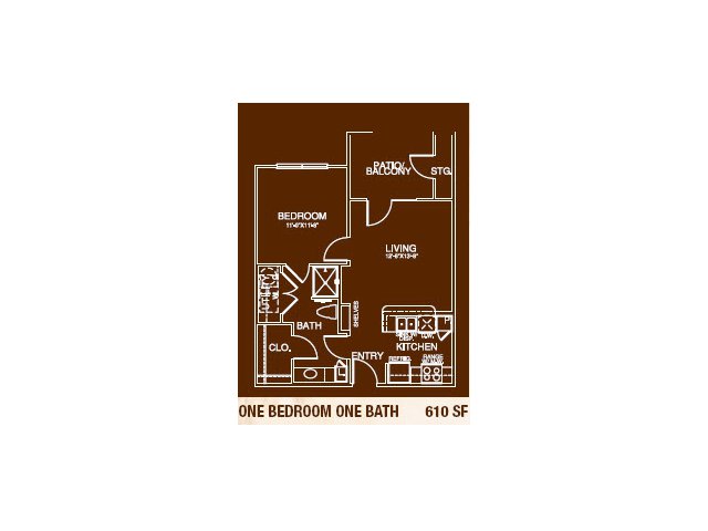 1 Bedroom - Floorplan 1 Apartment Unit: 235Apartment Model: 1 Bedroom1 Bedroom, 1 Bath, 610 sq ftAvailable Now1 Bedroom