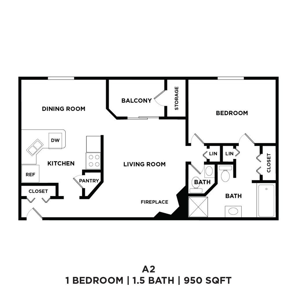 One Bed 1.5 Bath 950 Sqft - Floorplan 1 2 Bedrooms
