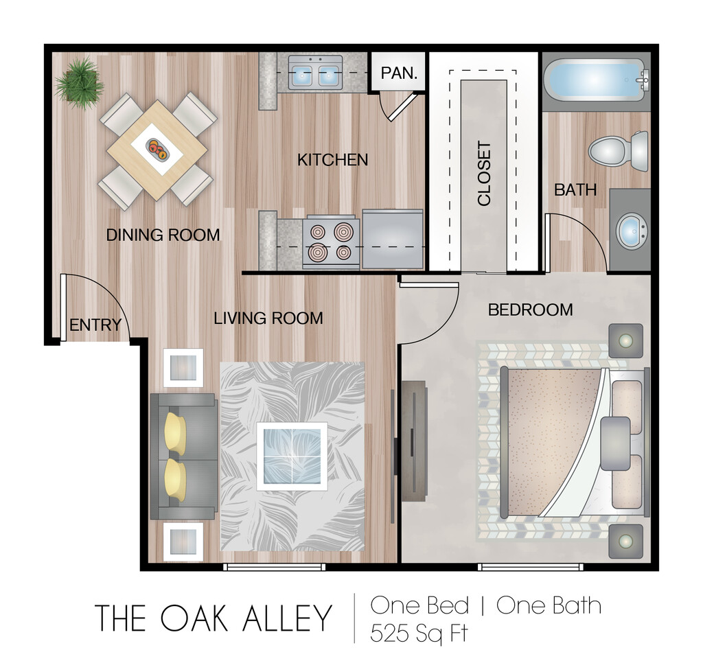 Apartment Model: The Oak AlleyFrom $8791 Bedroom, 1 Bath, 525 sq ftAvailable Now![]()