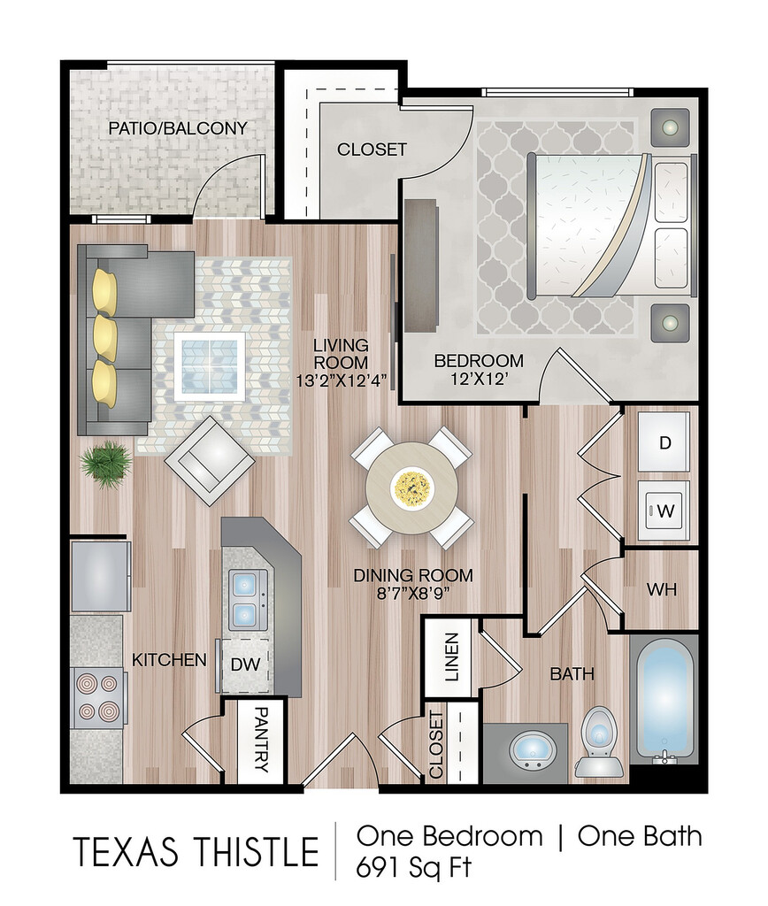 Texas Thistle – Premium Upgrade - Floorplan 2 Apartment Unit: 01-07208Apartment Model: Texas Thistle – Premium UpgradeFrom $1,1951 Bedroom, 1 Bath, 691 sq ftAvailable NowThe Blue Bonnet - Premium Upgrade