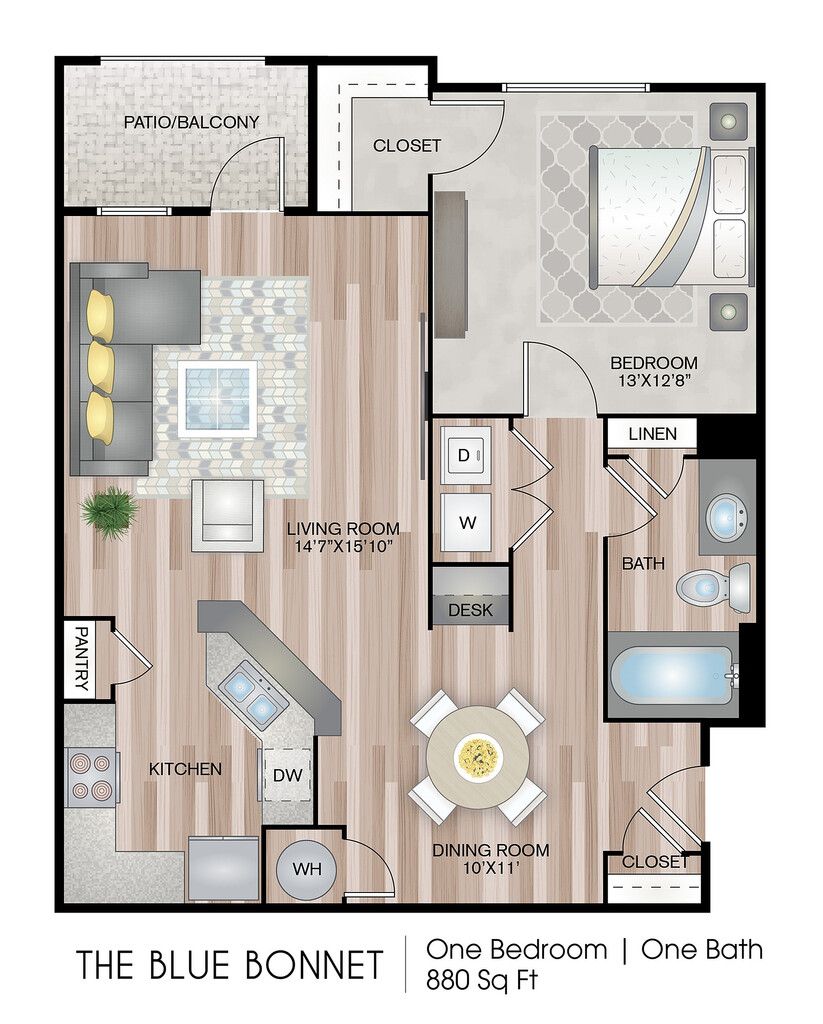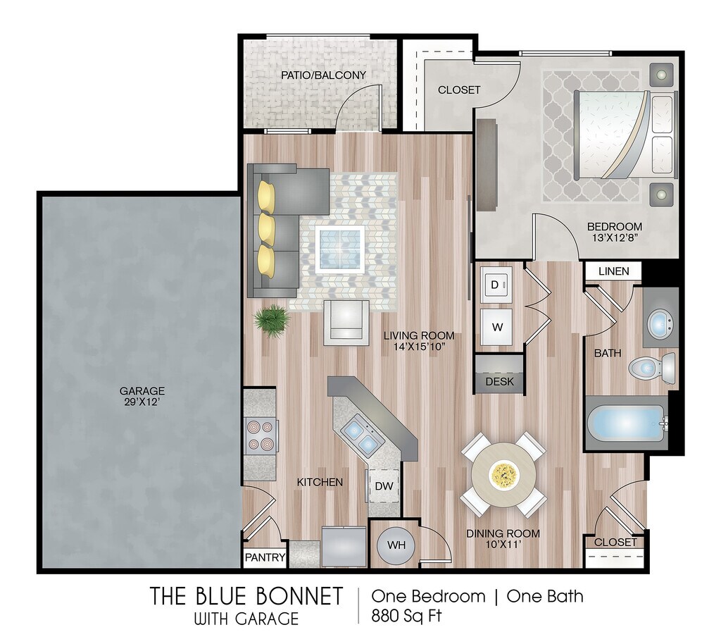 Apartment Model: The Blue Bonnet - Premium UpgradeFrom $1,3201 Bedroom, 1 Bath, 880 sq ftAvailable Now![]()
