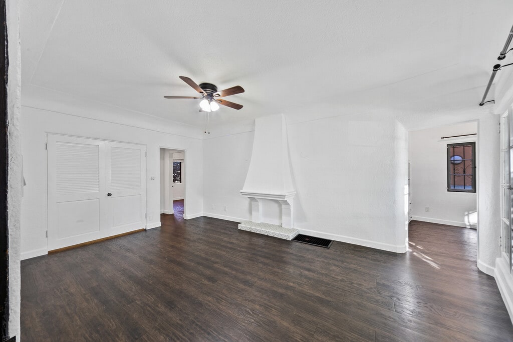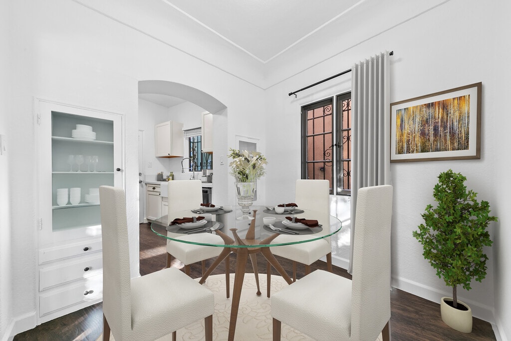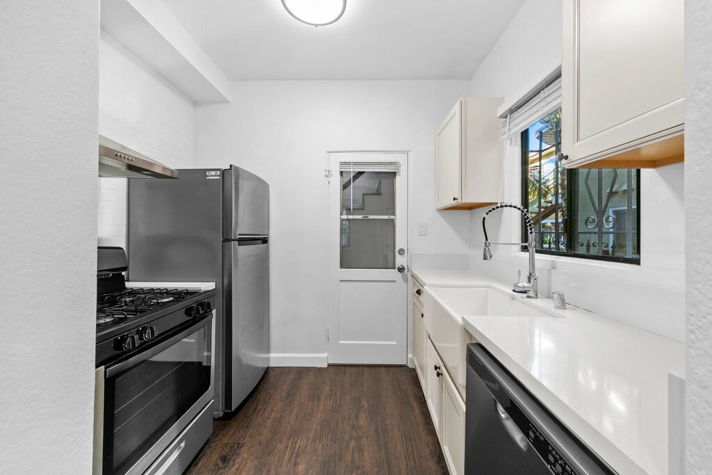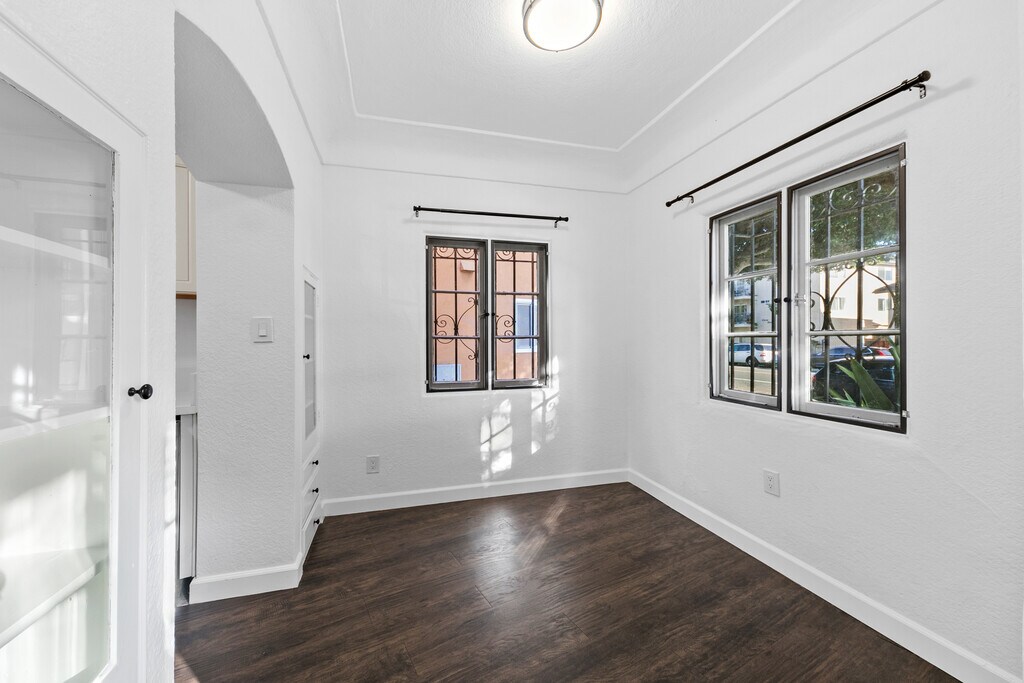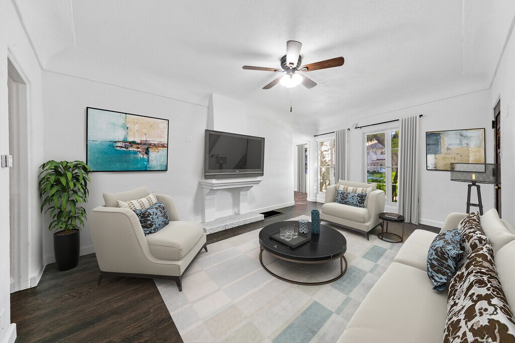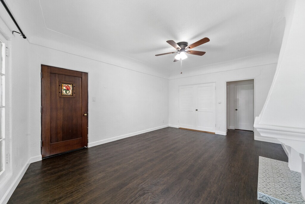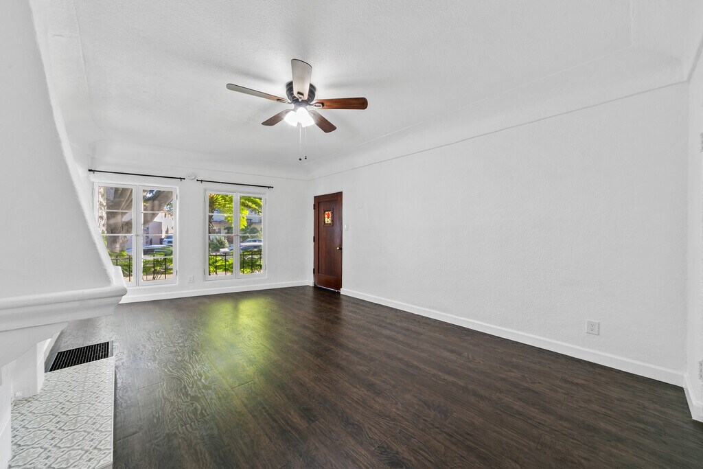 This upgraded downstairs 1-bedroom, 1-bathroom Spanish-style unit offers high ceilings, a spacious living room with a decorative fireplace, and large windows for great natural light. The kitchen features stainless steel appliances, quartz countertops, and a farmhouse sink. Enjoy a full-size in-unit washer and dryer, walk-in closet, breakfast nook, flex space, and private storage cupboard.