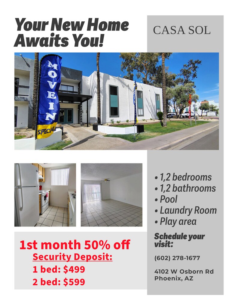 Looking for something that is cozy, spacious and walking distance to Schools, Restaurants, Grocery Store and much more? This is a perfect community for you then. Here at Casa Sol we offer that and more, we currently have for immediate move in for 1 and 2 bedrooms. Come and visit us today. Our Office team is ready and would be more then happy to assist you in your rental needs.