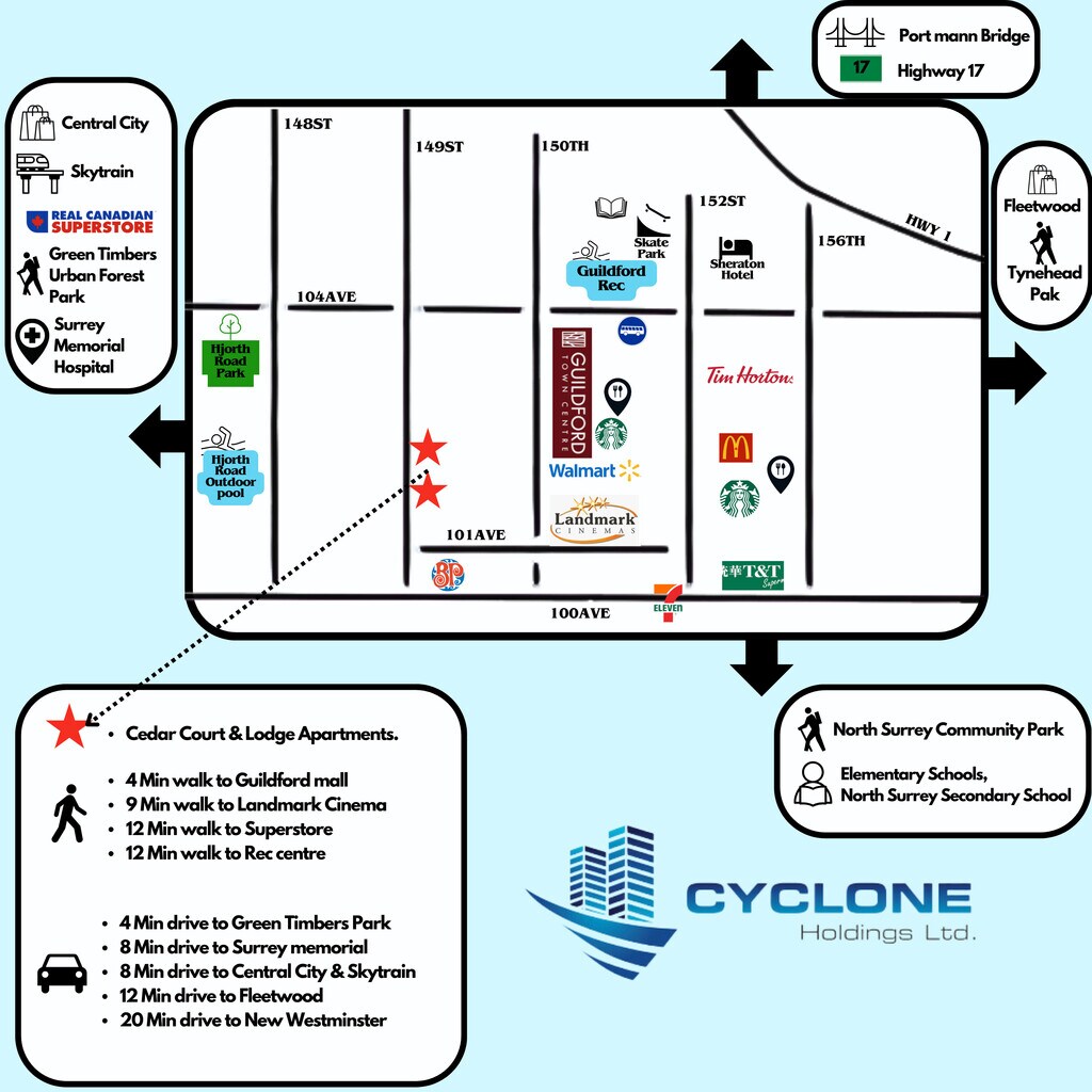 Conveniently positioned in the heart of the Guilford district, Cedar Court and Cedar Lodge apartments are just a few steps away from Guilford Town Centre. This location offers a plethora of dining and shopping options, catering to diverse preferences. Whether you're exploring the serene outdoors of Green Timbers urban forest, catching a movie at Landmark Cinemas on a rainy day, or simply indulging in culinary creations in your recently renovated kitchen, this is where "The future lives." Benefit from the peace of mind provided by on-site management and take advantage of the newly installed card-operated laundry facilities on every floor. Your rent covers the costs of heat and hot water, and there are various on-site parking options available for your convenience. What's nearby: Guildford Town Centre Walmart Real Canadian Superstore Surrey Public Library Surrey Recreation Center Movie Theaters Many Restaurants, coffee shops 2 Outdoor Pools for summer Bonacord Elementary Hjorth Road Elementary Guildford Park Secondary Johnston Heights Secondary Bus Service to Skytrain and Downtown Vancouver