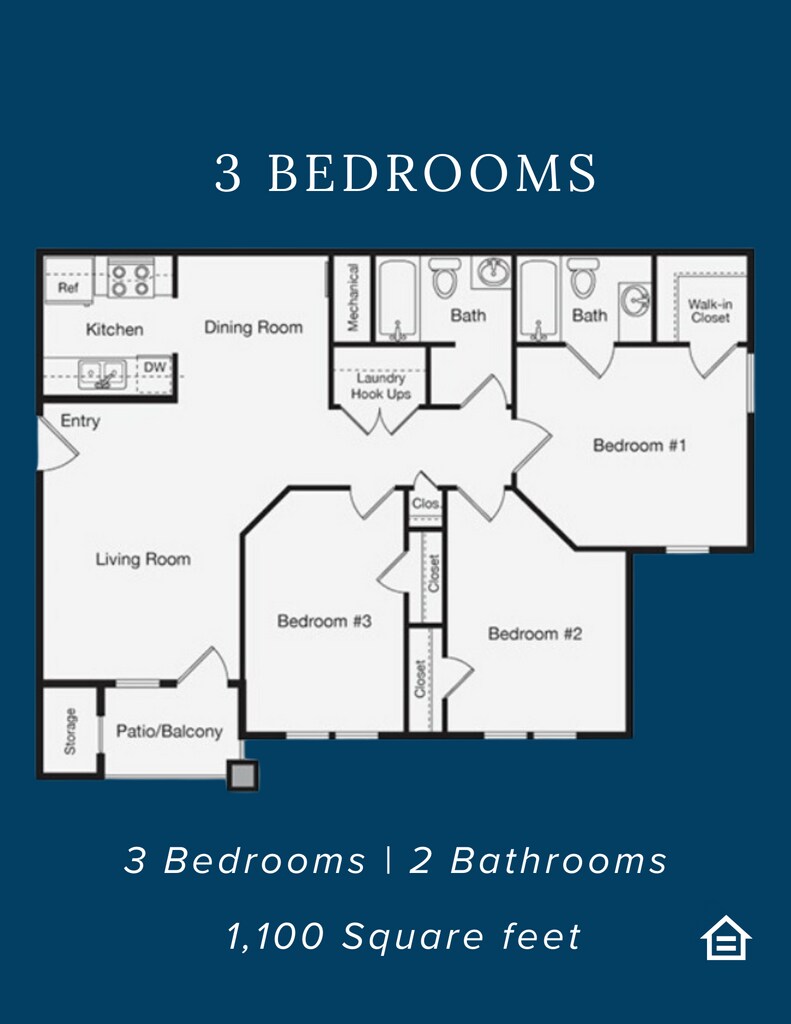 3 Bedroom 2 Bathroom - Floorplan 1 Apartment Unit: 100GApartment Model: 3 Bedroom 2 Bathroom3 Bedroom, 2 Bath, 1100 sq ftAvailable Now3 Bedroom 2 Bathroom