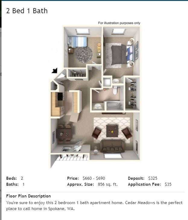 Apartment Model: 2 Bedroom 1 BathFrom $1,0452 Bedroom, 1 Bath, 856 sq ftAvailable Now![]()
